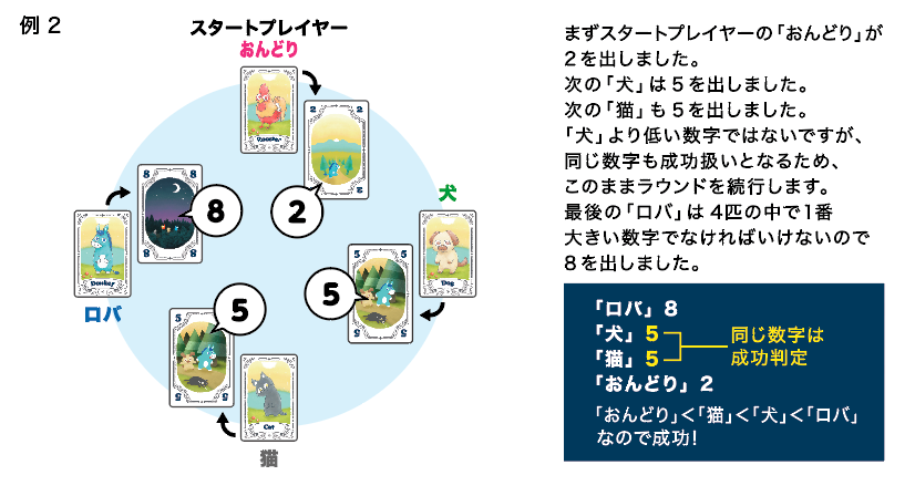 数字の大小が関係する動物同士で、同じ数字だった場合も成功扱いとなります。