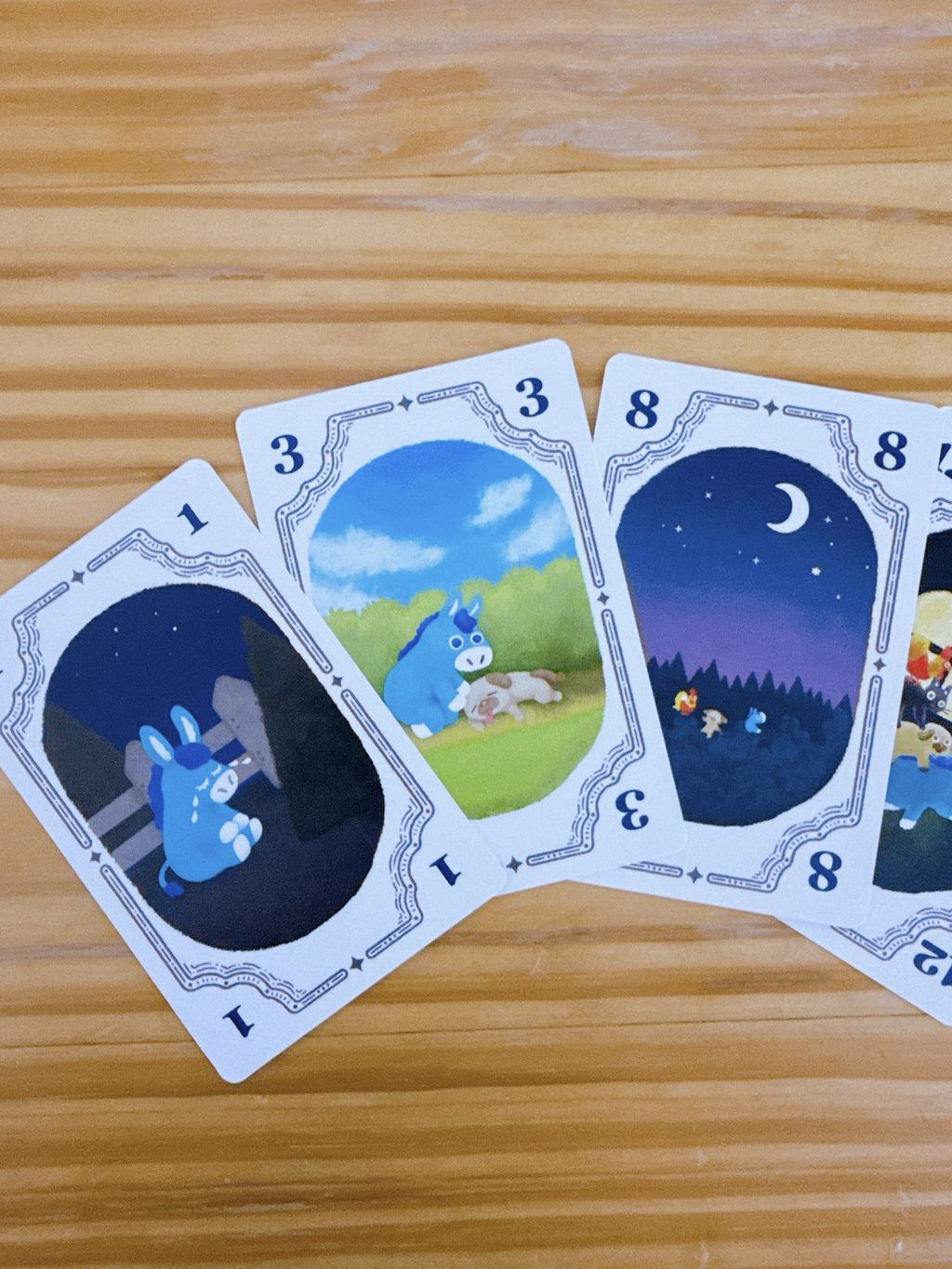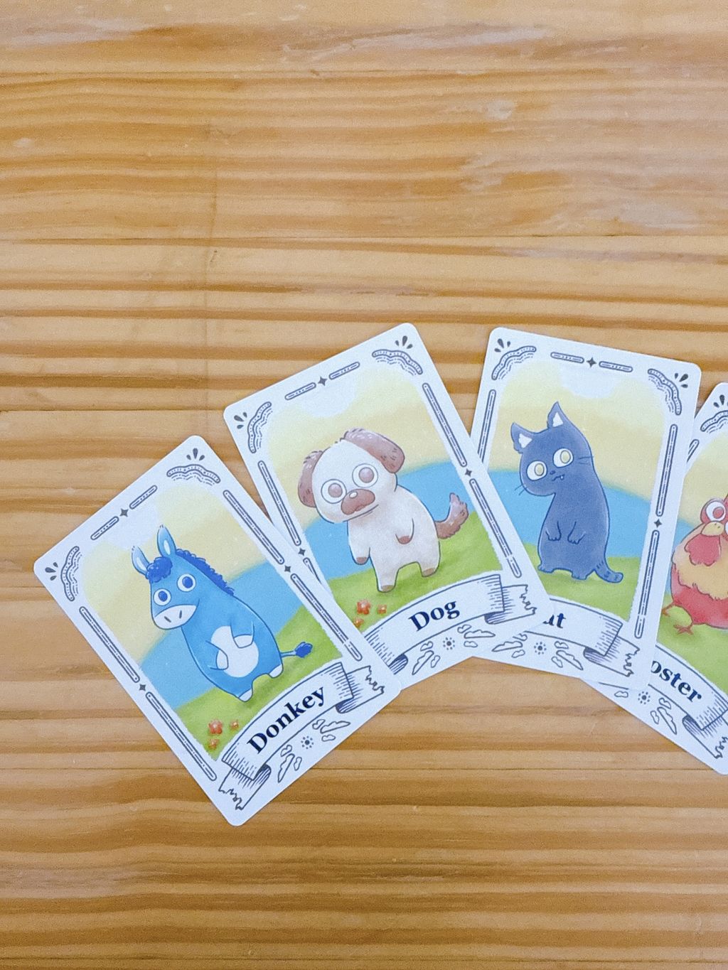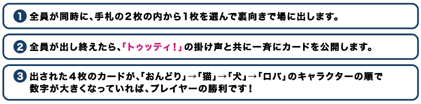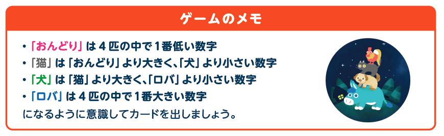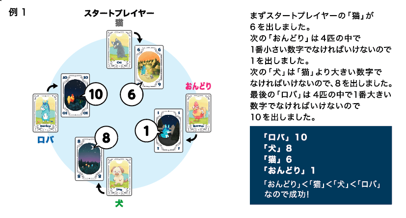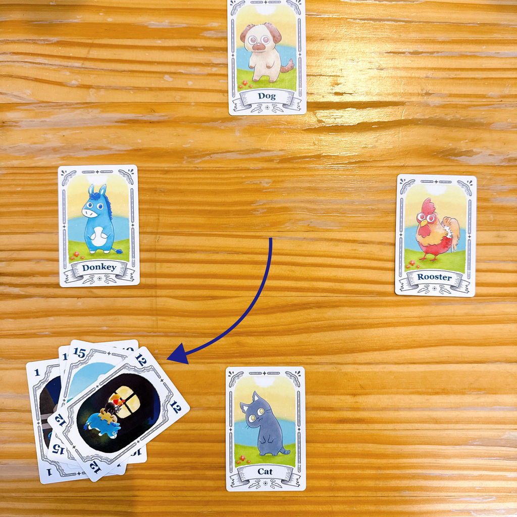 スタートプレイヤーから時計回りに1人ずつ、手札の数字カードから1枚選んで表向きに場に出します。各プレイヤーの担当するキャラクターの出した数字の関係性が、「おんどり」<「猫」<「犬」<「ロバ」になることができれば成功です。