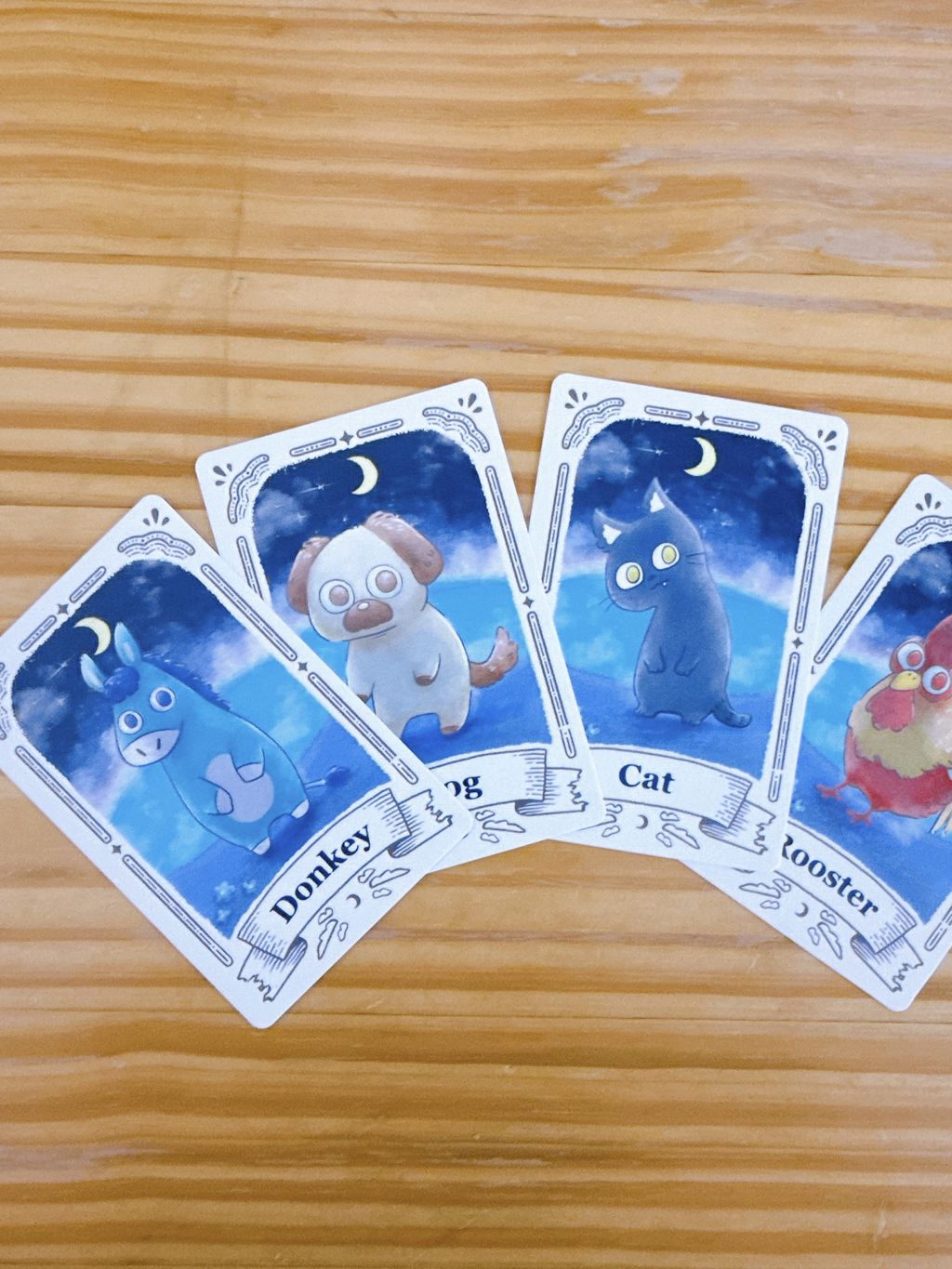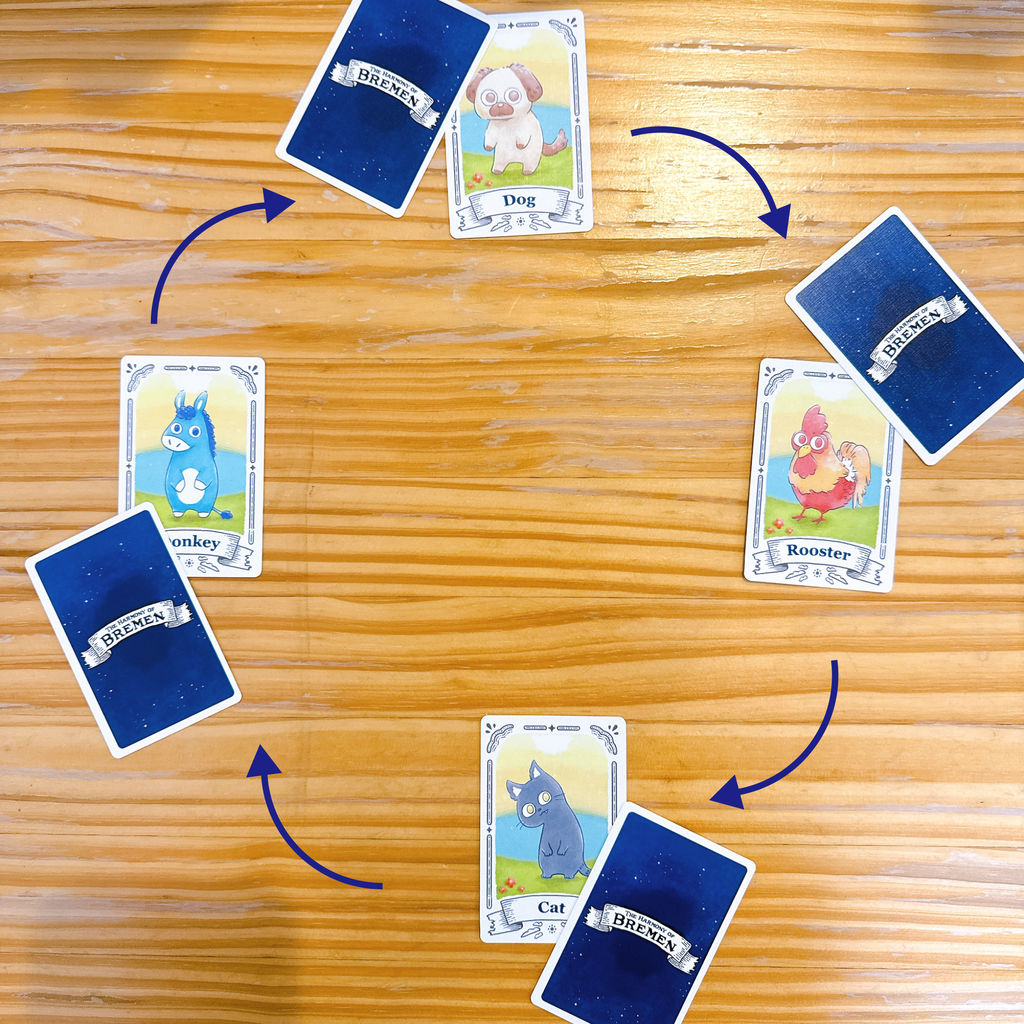『The Harmony of Bremen』は、4人で力を合わせて挑む協力型カードゲームです。4人のプレイヤーはそれぞれ「ロバ」「犬」「猫」「おんどり」の4匹の動物に分かれて、毎ラウンド1枚ずつ数字カードを場に出していきます。場に出したカードの数字が、「おんどり」→「猫」→「犬」→「ロバ」の順に大きく(昇順に)なるよう、協力してハーモニーを奏でていきましょう。全10ラウンドを無事に乗り越ることができれば、あなたたちはブレーメンの音楽隊として勝利を収めます!