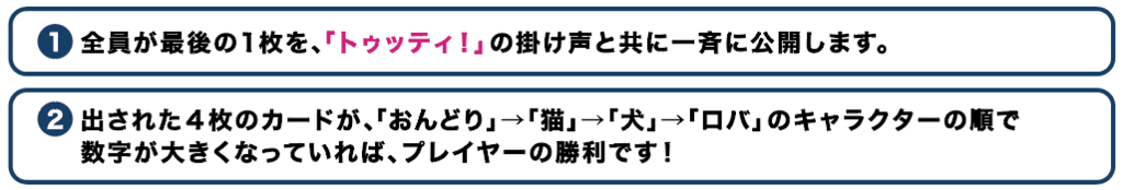 ・プレイヤーの誰かがルールに当てはまらないカードを出してしまった(ラウンドを失敗した)時点で、ゲームは即座に敗北となります。「フィナーレ」で失敗した場合も同様に敗北となります。