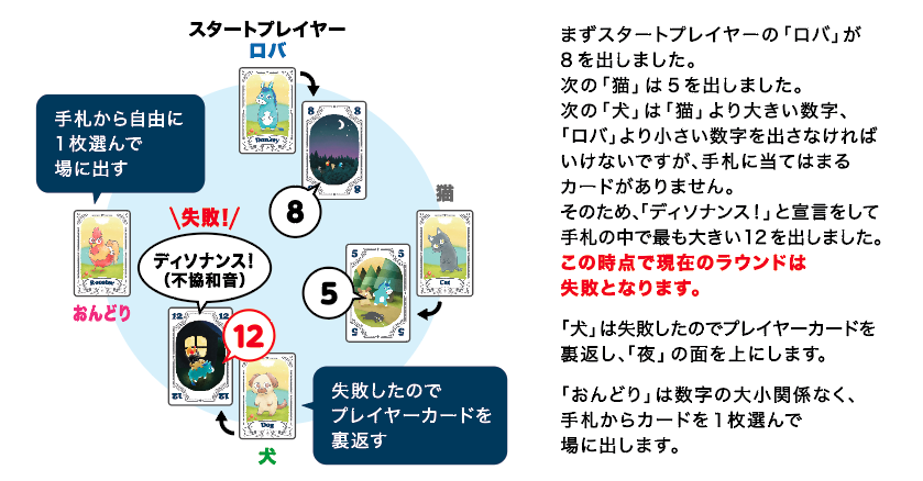 手札の中にルールに当てはまるカードがない場合、手札の中で最も大きい、もしくは最も小さい数字のカードどちらかを選び場に出します。その際、「ディソナンス!」と宣言をしながら出してください。カードのプレイの途中で、プレイヤーの誰かがルール通りでないカードを出してしまった場合、その時点でラウンドは失敗となります。