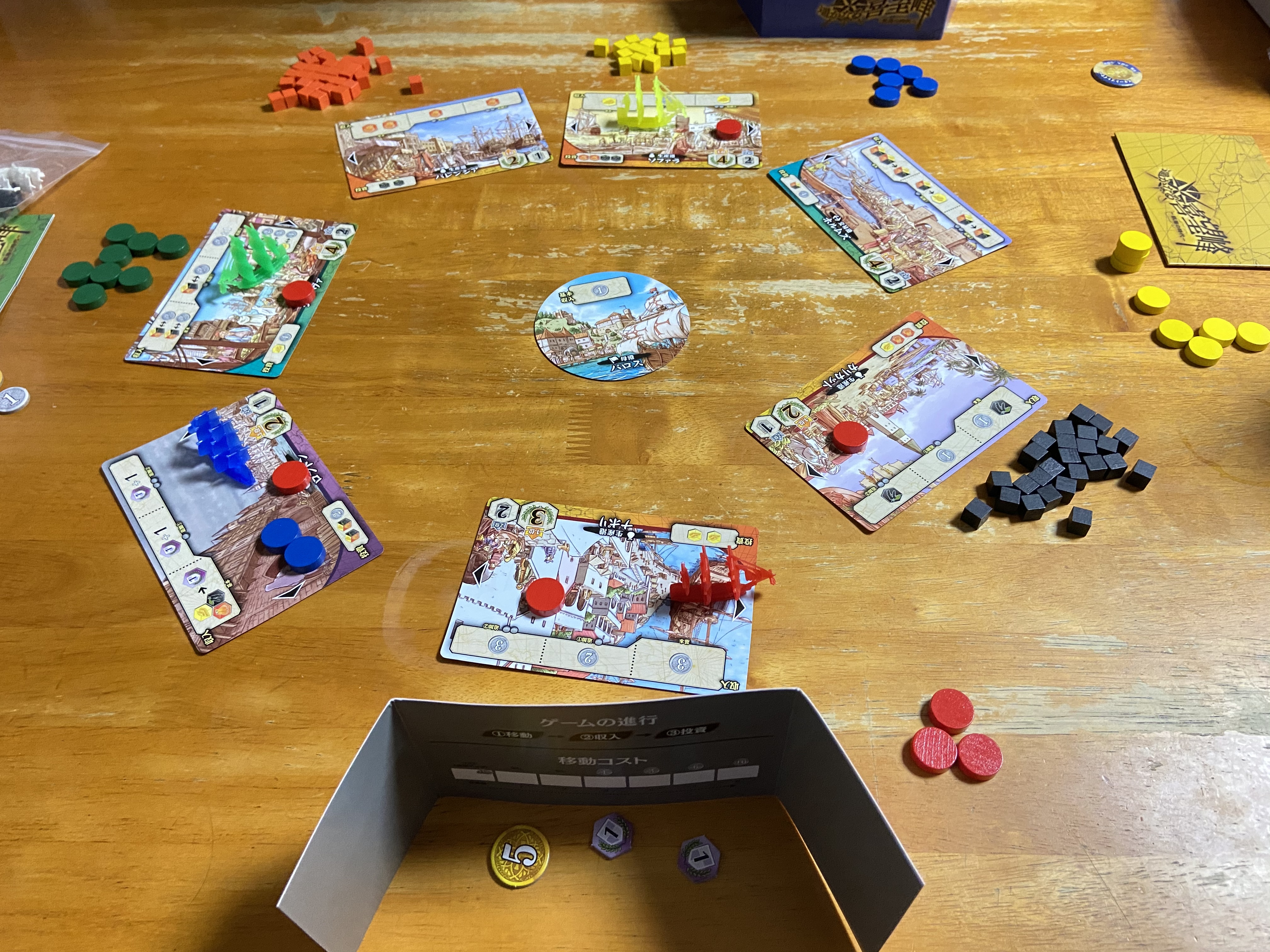 船の進め方や距離にも制限があって、そこそこ戦略を練る必要もある。アブストラクトに近いから、どちらかと言えばガチンコ勝負。相手の状況が見えない中での投資とか交易も、どこまで強気にいくべきかを考えたりするのも楽しい。まだやってないけど、拡張が全部入りっていうのも良い。展開が変わって何度でも遊べそう。