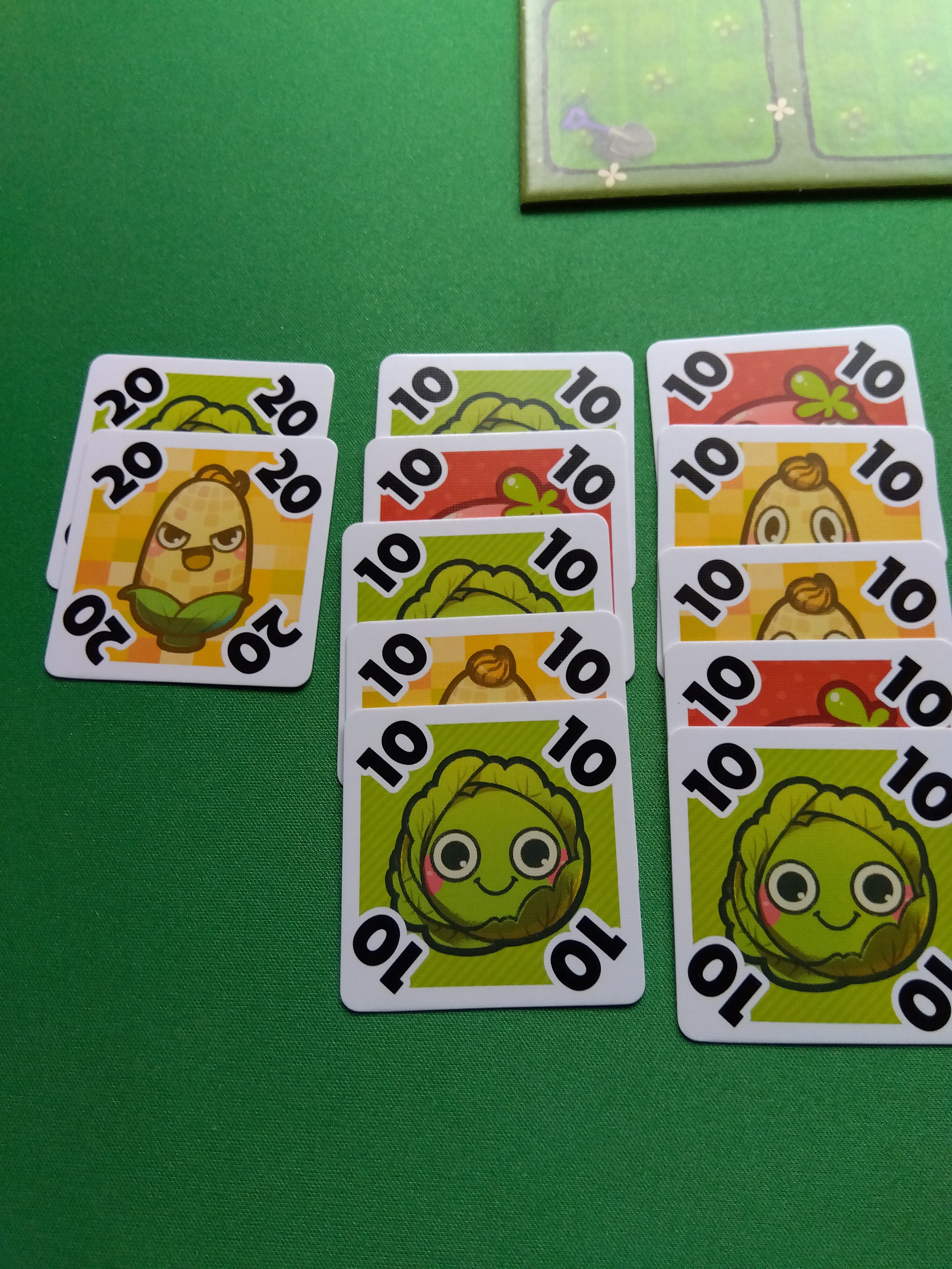 野菜(トマト・トウモロコシ・キャベツ)カード:-20点~20点と、各収穫物に1枚ずつ40点のカード。