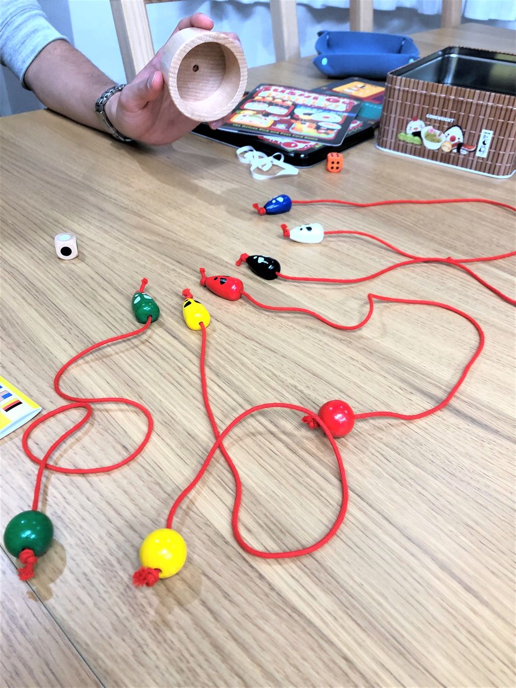 とっても可愛いネズミさん。ネズミVSネコで、ネコ役はカップを持ち、ネズミ役はネズミにつながっている球を近くに置きます。ダイスを振って出た色を、どちらの役も急いでとります。捕まえるとネコの勝ちです。