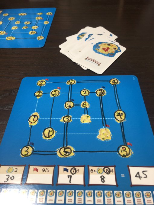 みんな同じボードを持って、共通の山札からめくられたカードを見て、みんな同時に数字を書き、橋を書く。