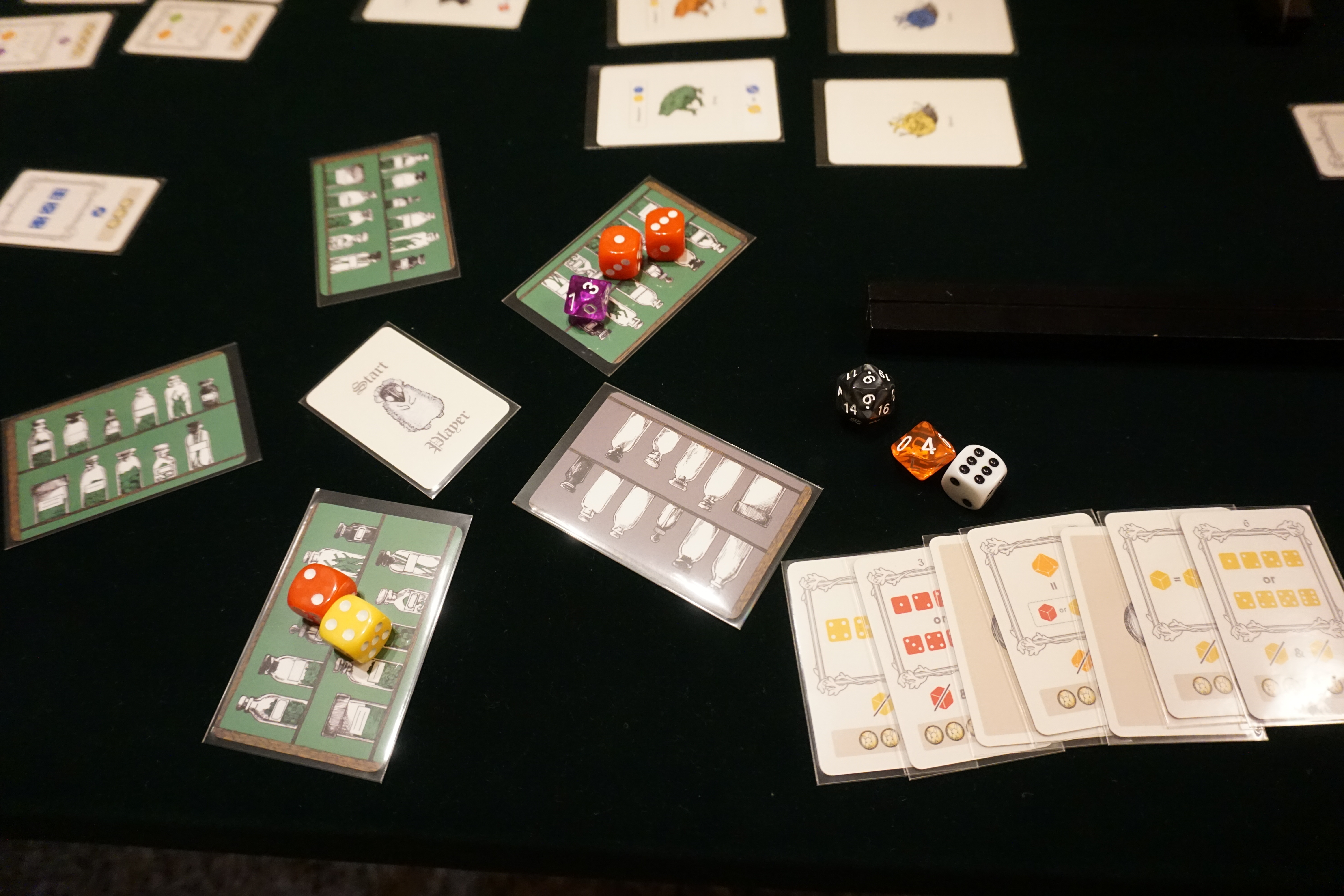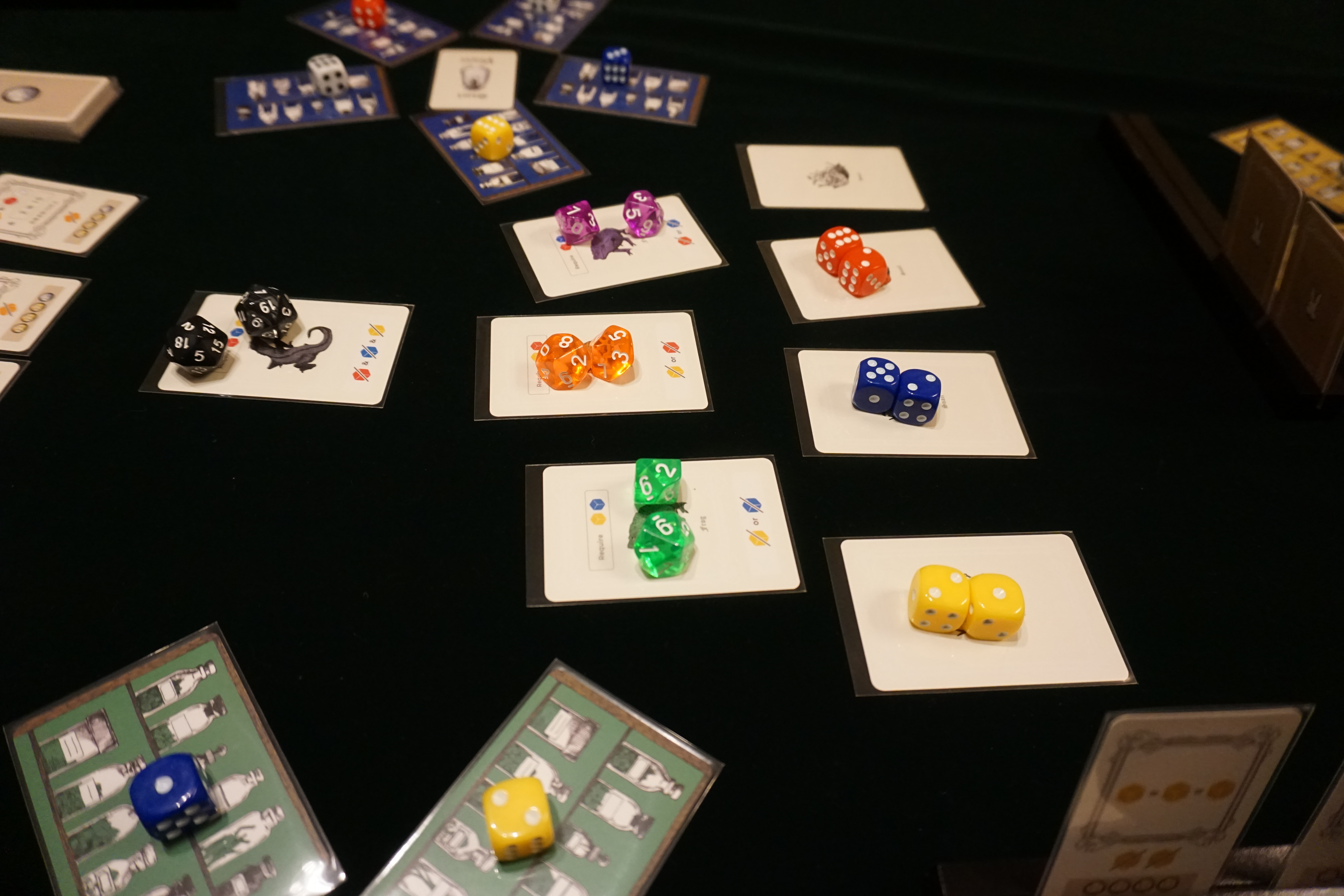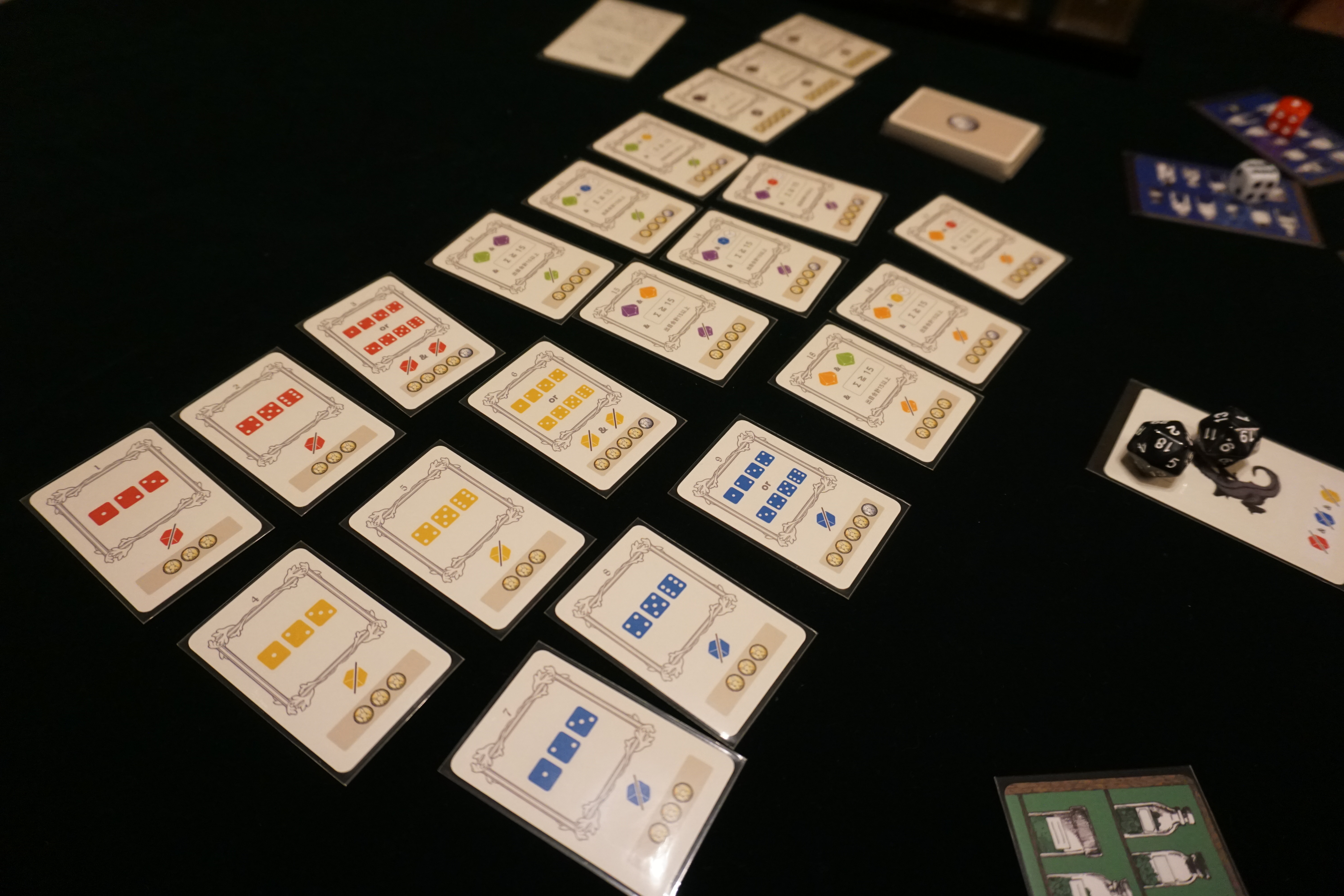 納品カードは各方向性ごとに3枚ずつありますが先取りでなくなってしまうこと、プレイヤーごとに秘密の納品カードが2枚あることが戦略性を高め、ファーストアクションから始まる自分の保管庫と素材置き場それぞれの出目から何を納品するのか、他のプレイヤーが何を狙っているのかなど読み合いが楽しく、上手くダイスが取れたと思って保管庫にしまってみたら「なんか思ってたんと違うぞ」となったりきちんと考える必要がある分、勝ったときの満足感は重ゲーにも負けないなと感じました。