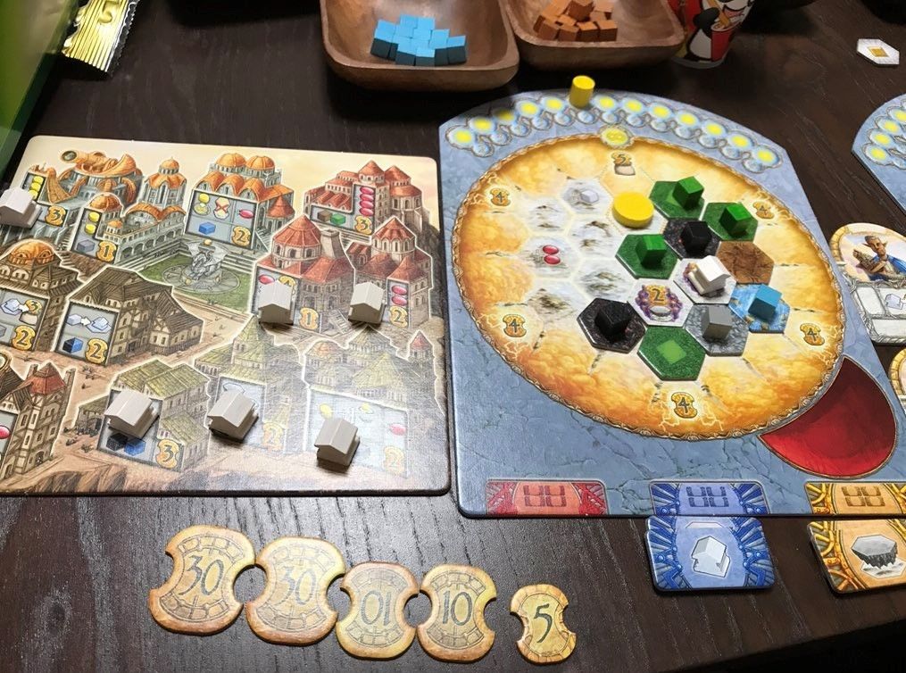 太陽の力を使って土地を開発したり、寺院の力で都市を開発して得点を稼ぐゲームです。