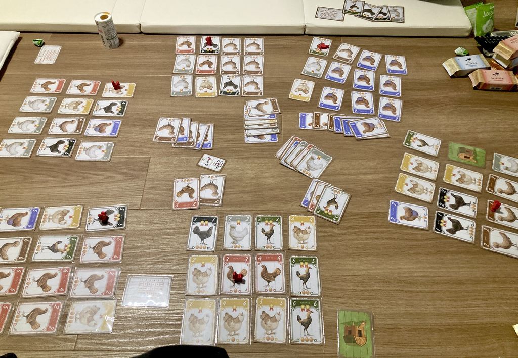 1〜2名プレイでは狙う鶏の種類が被りにくいので平和にカード配置をし高得点を競うプレイ感だが、3〜4名になると狙いの競合が現れるため、ハンドマネジメントの検討要素が多くなりなかなかの熟考ゲームへと変化する。