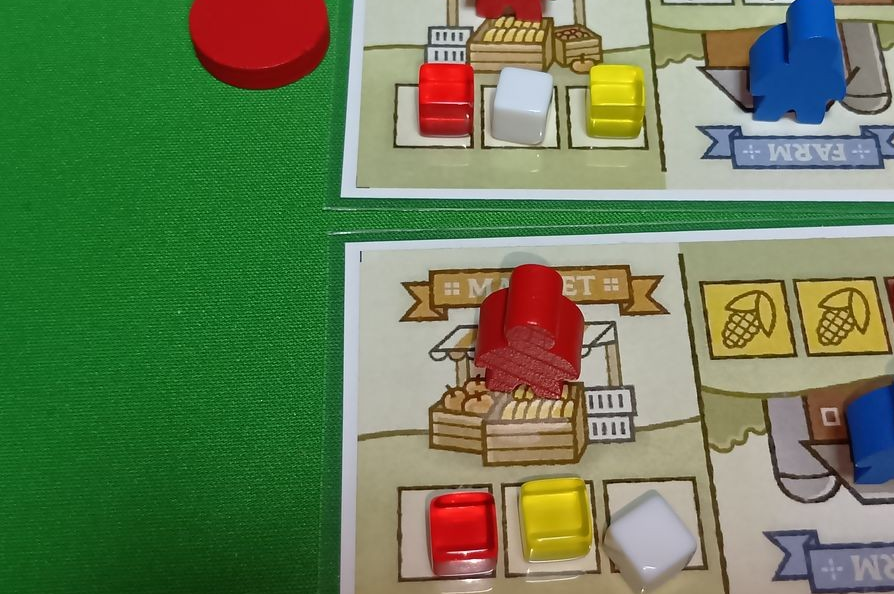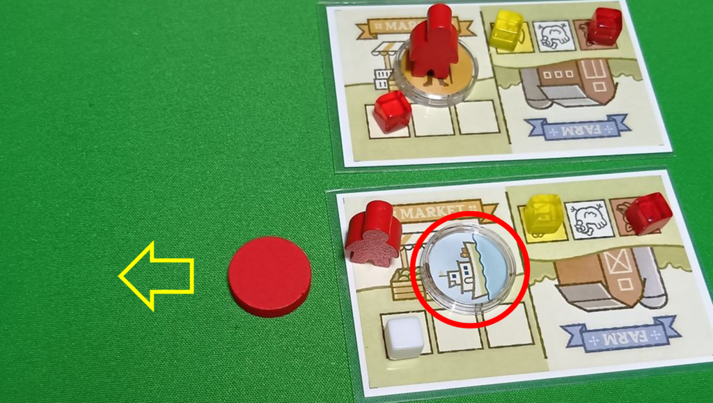 また、農夫が農場から市場に到達すると、各市場に置いてある「ボーナストークン」の内容を確認できます。続いて市場からどこかの農場に戻る際に、このボーナストークンをを獲得することができ、以降好きなタイミングで1度使えます。