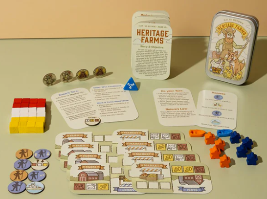 プレイヤーは農夫として、自分の4つの農場から品物(赤:キツネ・白:鶏・黄:トウモロコシ)を川向の4つの市場に運搬しなければなりません。