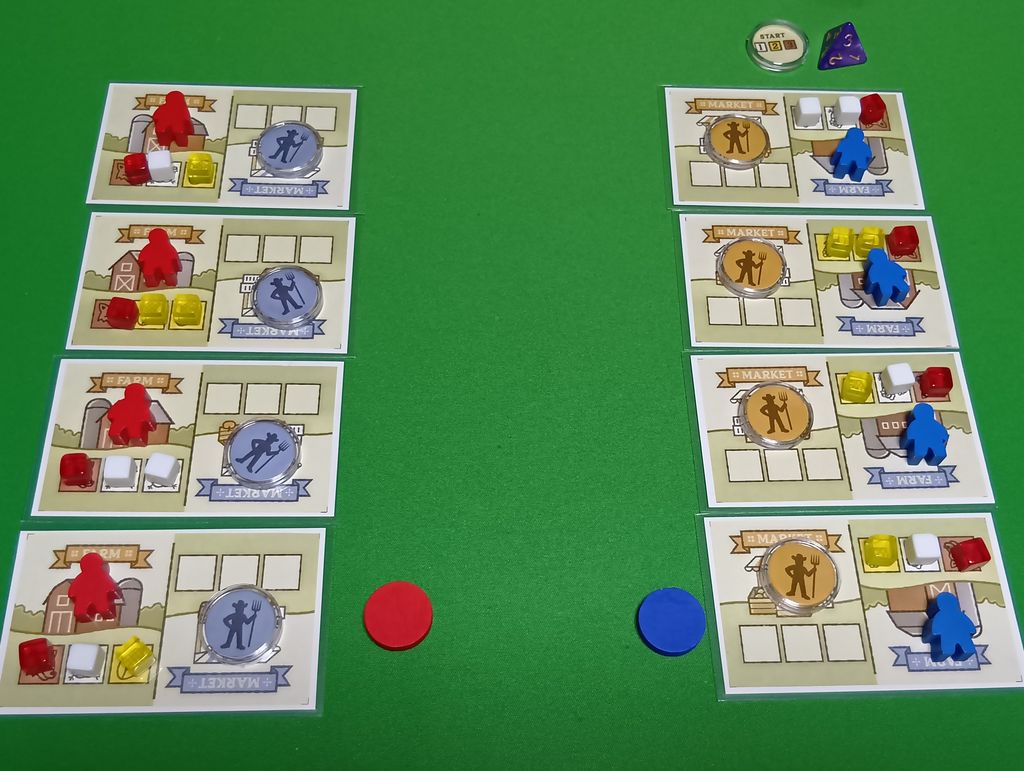 川(空きスペース)を挟んで両側に4枚ずつカードが並びます。カードには市場/農場が描かれており、3つの品物が置かれます。また、自分の市場には、ボーナストークンがそれぞれ1つずつ配置されます。