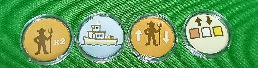 トークンは4種類。相手の船があるところは本来選択不可ですがどけることができたり、自分の品物や農夫を移動させたり、農夫がいるところに2人目を1回だけはいちできたりといった効果。