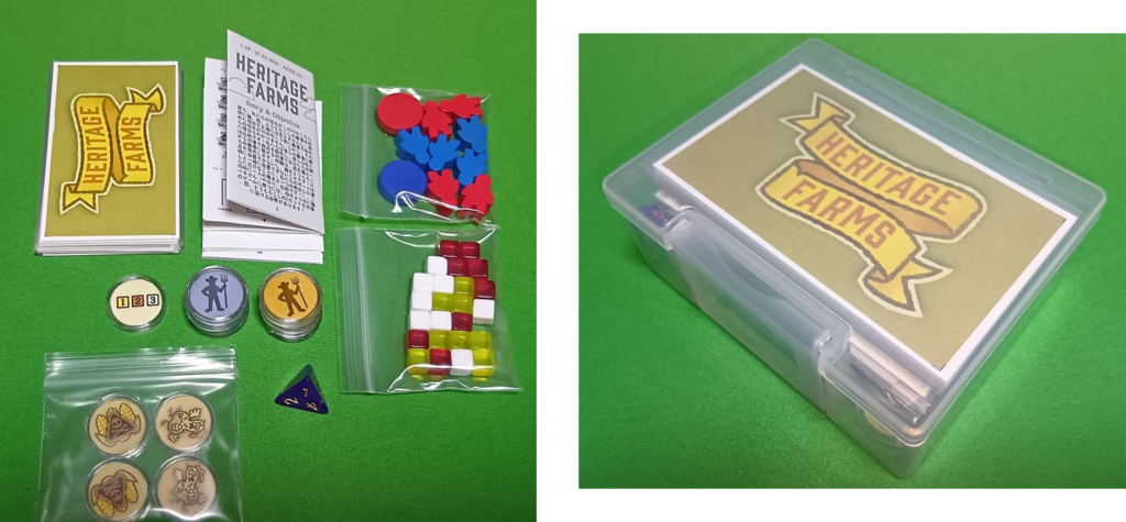 【左の内容物(4面ダイスとコインカプセル13枚とキューブと農夫トークン8個とカードと取説)がぎりぎり収まるサイズ感。私は印刷していませんが、データ内にはプレイマットデータもあったりします】