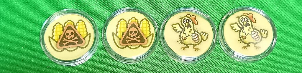 今回ご紹介していない&試していないんですが、上級ルールでゾンビ拡張というものがありまして、ゾンビチキン&毒トウモロコシトークンを使います。普通の鶏をゾンビに変える効果&すべてを食べるゾンビチキンと、トウモロコシを毒に変え、全てのチキンを殺す毒トウモロコシトークンを導入。基本ルールはそのままなんですがより運搬がえぐいことになりそうな感じです。