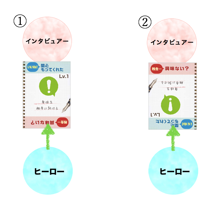 このように同じヒントカードでも意味する内容は表裏一体で異なります。インタビュアーはカードを差し出されたら評価に応じて適時自分のコミュニケーションの仕方を変化させると良いでしょう。