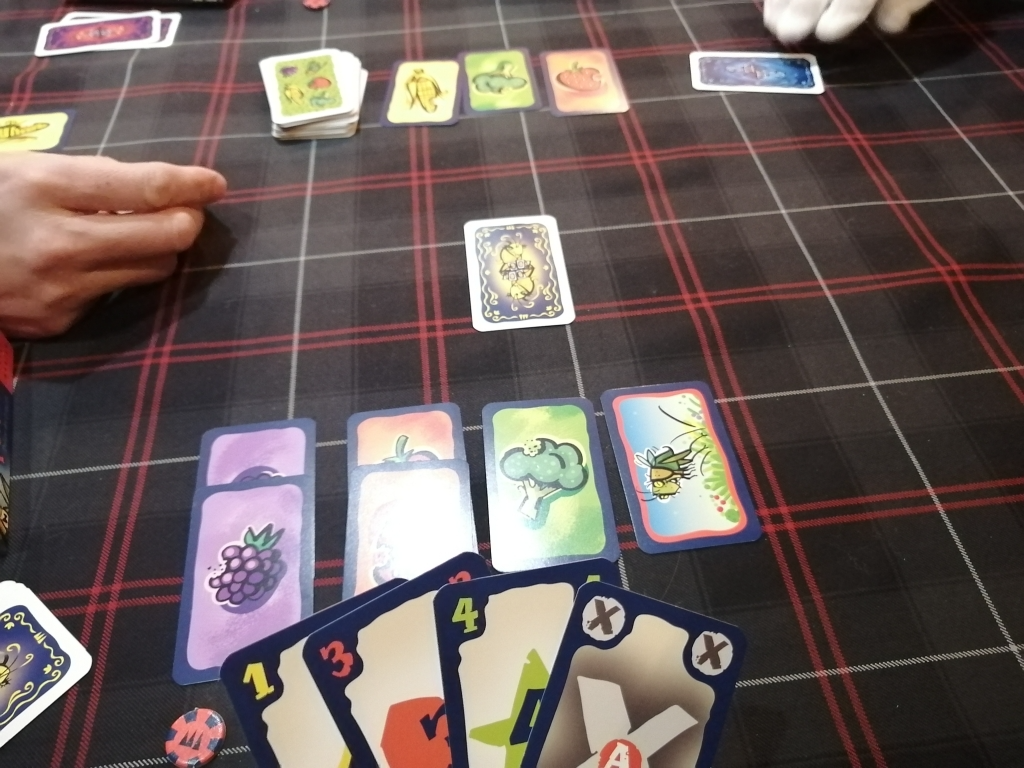 作物を収穫していくバッティングゲームで1〜6、特殊カード2枚の計8枚を使い切ればラウンド終了で作物を1番所持していたら1点獲得。同時にカードを1枚公開し、数字の高い順に作物を選び獲得して、同じ作物が3枚集まれば1点。バッタが3枚集まると作物はすべて食べられ無くなる。
