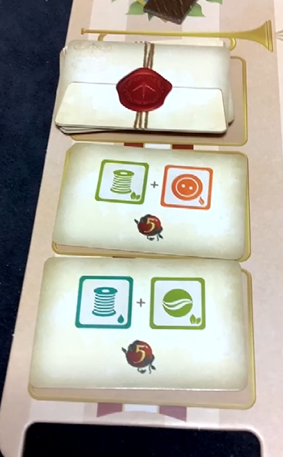 主にこのアイコンのカードを獲得します。初期に一枚手札にありますが、これの効果をどちらか1つを自分のターンに任意で行えます。右側のアイコンし納品するときに使いますので説明は後ほど。