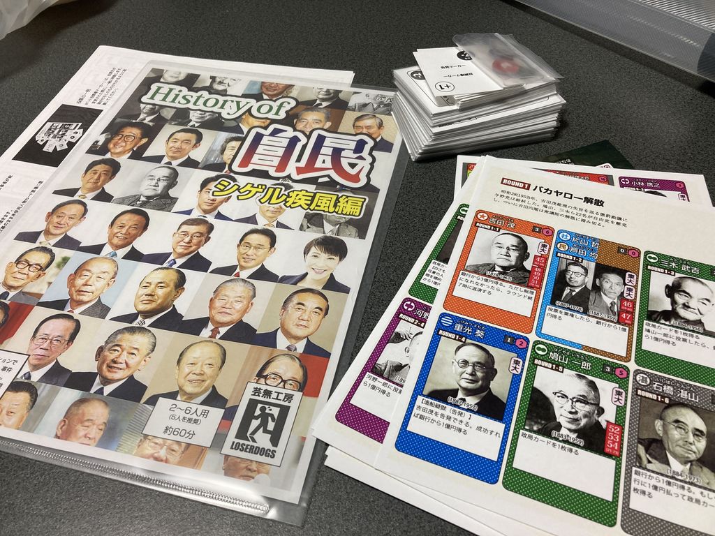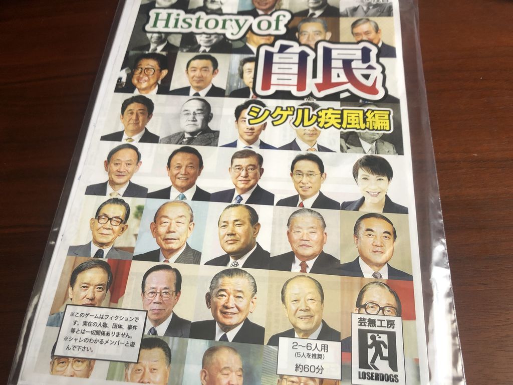 単独プレイヤーです。「History of 自民 シゲル疾風編」ヒストリーオブ自民、1年続いた石破政権の終わりに記念プレイ。あくまでフィクションストーリー。自民党総裁選を勝ち抜き名声ポイントを多く獲得したプレイヤーの勝利。多人数で遊ぶゲームです、一応2人からプレイできますが、投票ゲームなのでプレイヤーは多いほうが楽しそう。