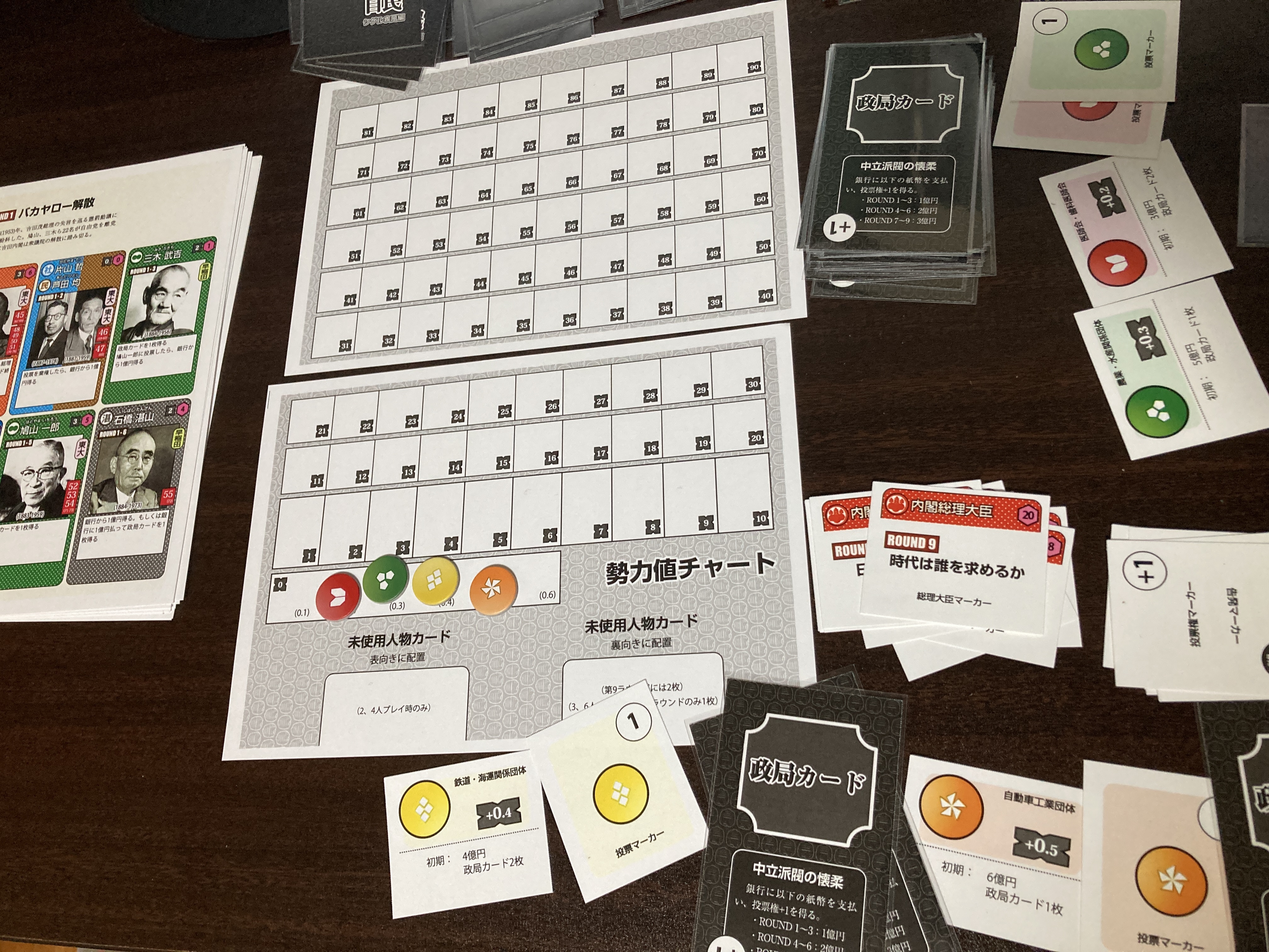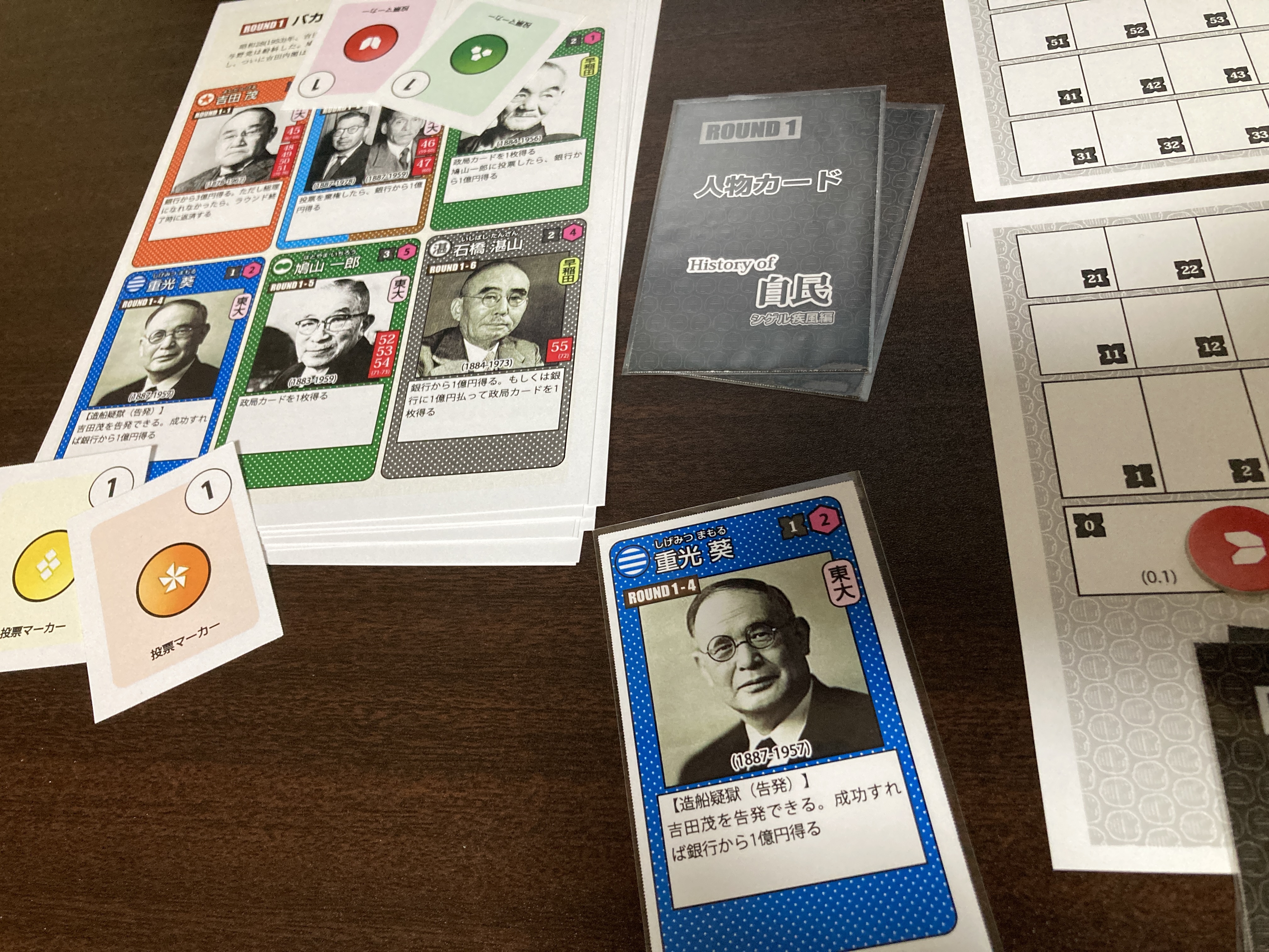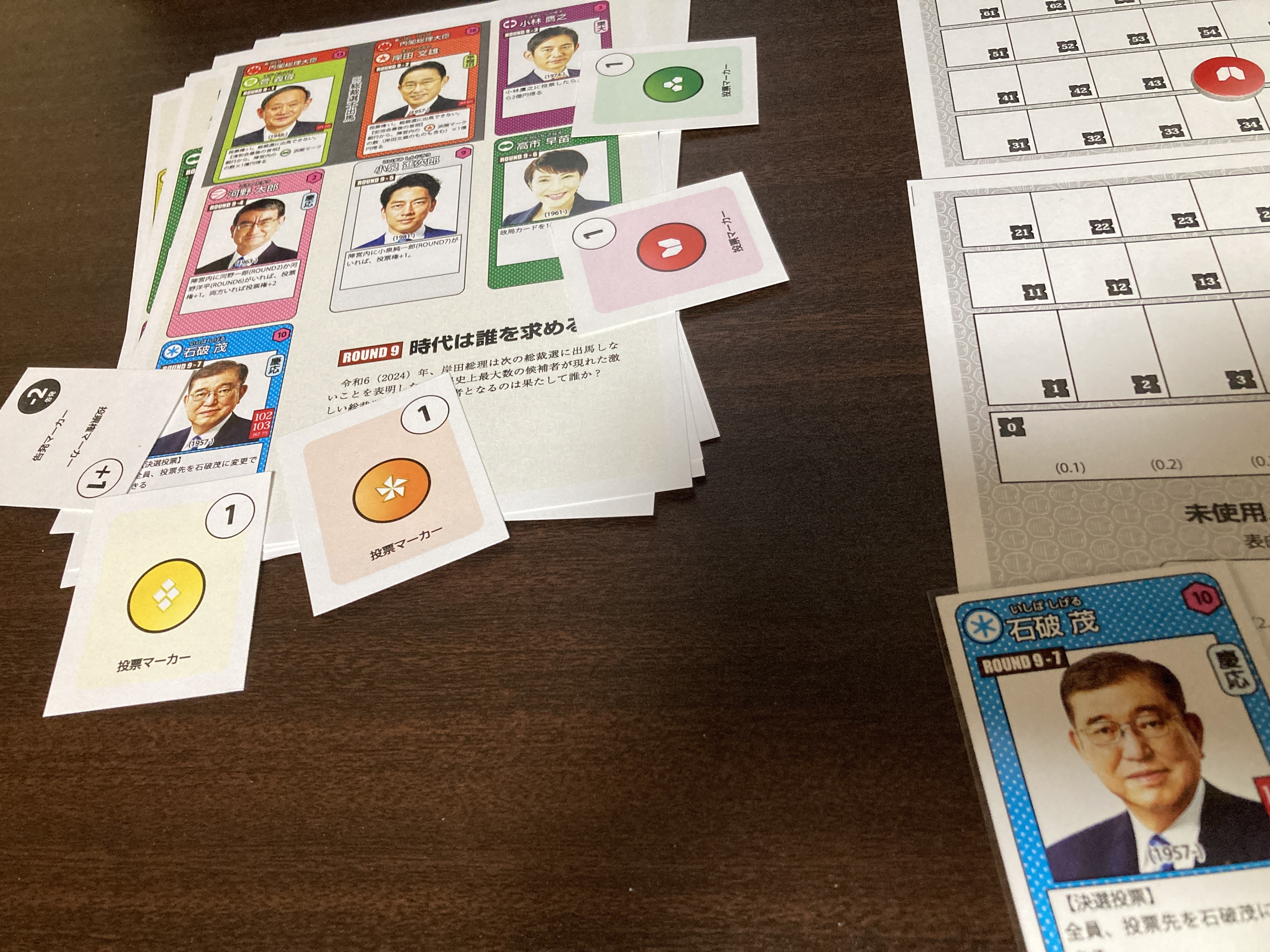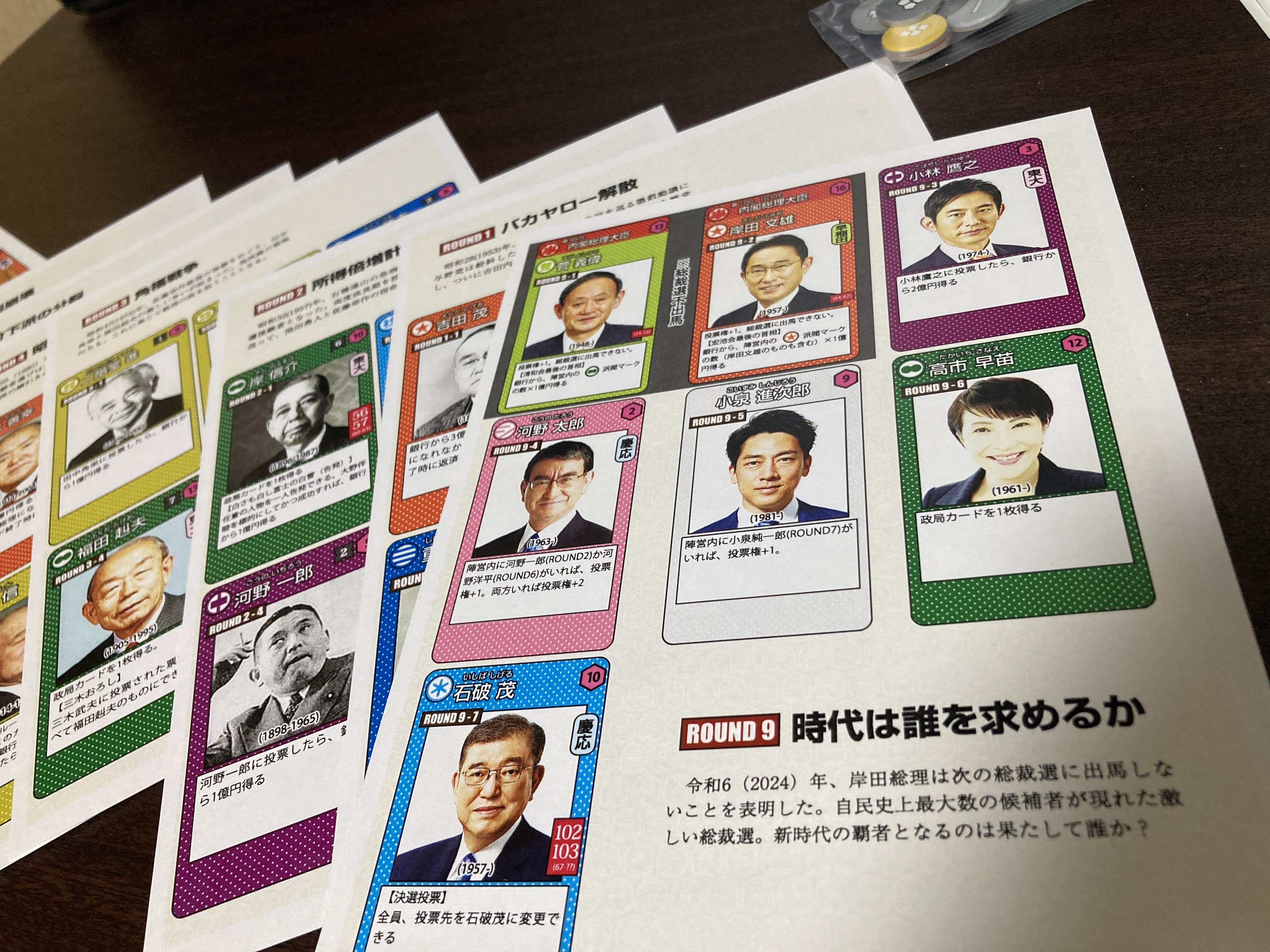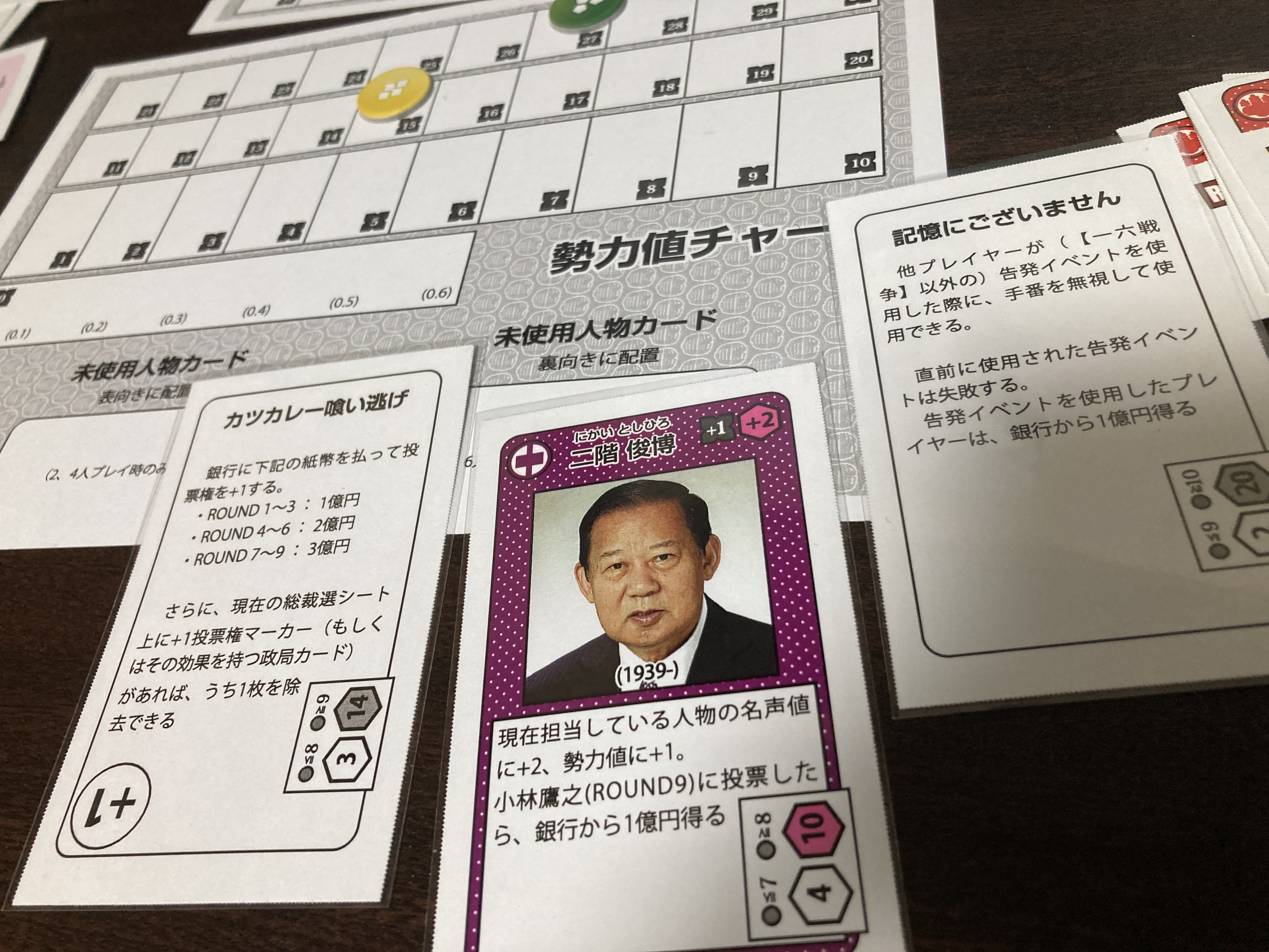 各ラウンドプレイヤーは投票をおこない自民党総裁を決めていく。このゲームでは、自民党総裁はそのまま内閣総理大事という事になっていまして、選ばれると追加で得られるポイントも高い。政局カードも駆使して対戦相手との駆け引きが大切になってきたり。政局カードは人物であったり聞いたことあるイベントだったり大きくお金が動きます。初期の応援団体でけっこうスタートかわるので運も必要。
