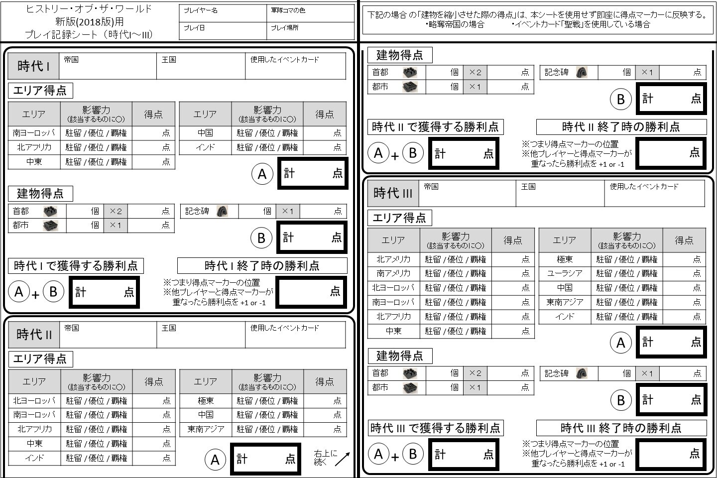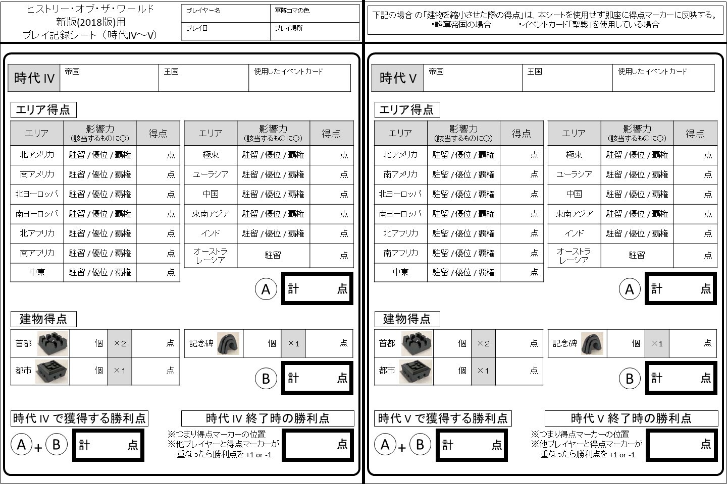 ヒストリーオブザワールドで時代毎に発生する得点計算ですが、広大なマップでチェックするエリアが多くて結構大変です。それを補助する「得点計算シート」と、両面印刷することで時代I~Vの得点計算を記録できる「プレイ記録シート」を作成しました。