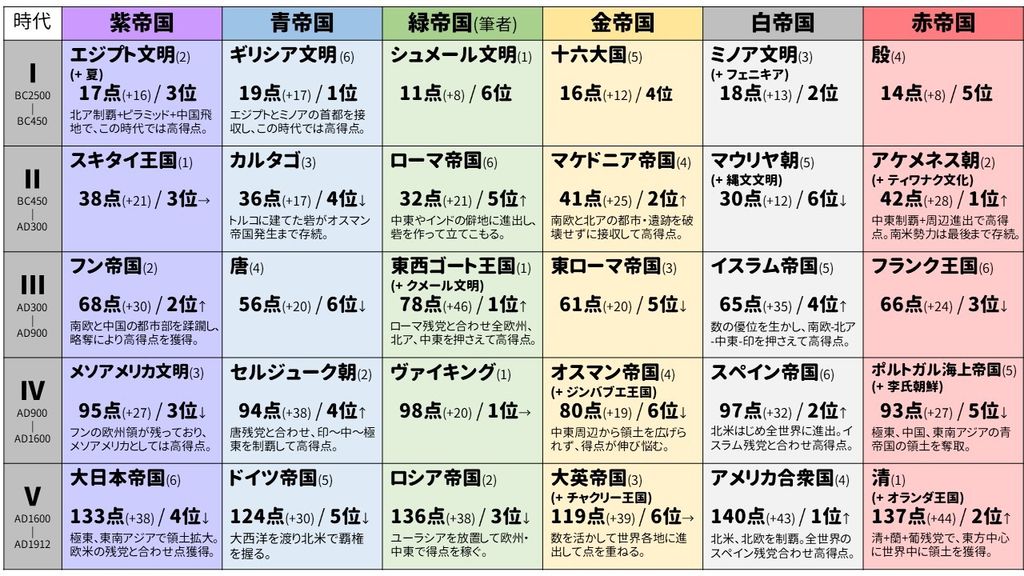 筆者(緑帝国)は、時代IIのローマ担当時に「僻地に砦を作って立てこもり、終盤までその領土を残してコツコツ得点する」という作戦を狙いましたがうまくいかず。時代IIIの東西ゴートで高得点を取り過ぎて少し目立ってしまったかもしれません。時代IIIで唐あたりを取り、得点を低く抑えつつ東方の僻地を取っておくべきだったかも。