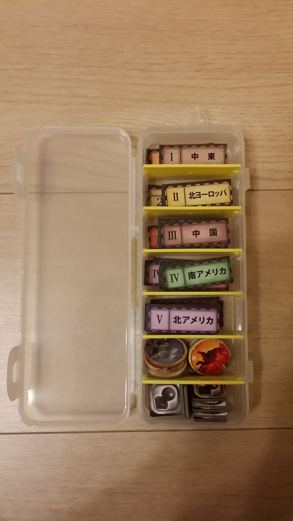 時代I~Vのエリアタイル、艦隊/隊商マーカー、包囲トークンはキャン★ドゥで購入した「シェルビー仕切ケース スモール」に収納。図ったかのようにピッタリ。このシリーズ、仕切が可動するので色々なボードゲームのコンポーネント収納に使えます。