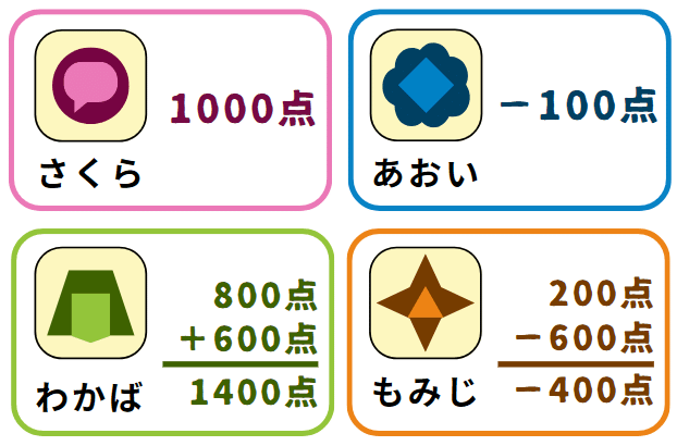 - A)トリックの勝利で取得したアプデ項目カードの枚数を合計し、枚数 × 100点します。