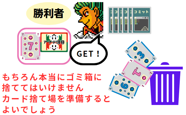 トリックの勝利者は、山札のアプデ項目カードを裏向きのまま1枚取得し、自分が出したコミットカードとセットで手元に置きます。