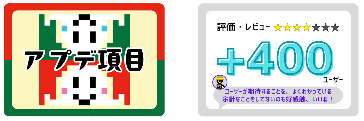 アプリのアップデート項目に応じた評価(ユーザー数の増減)を示すカードです。