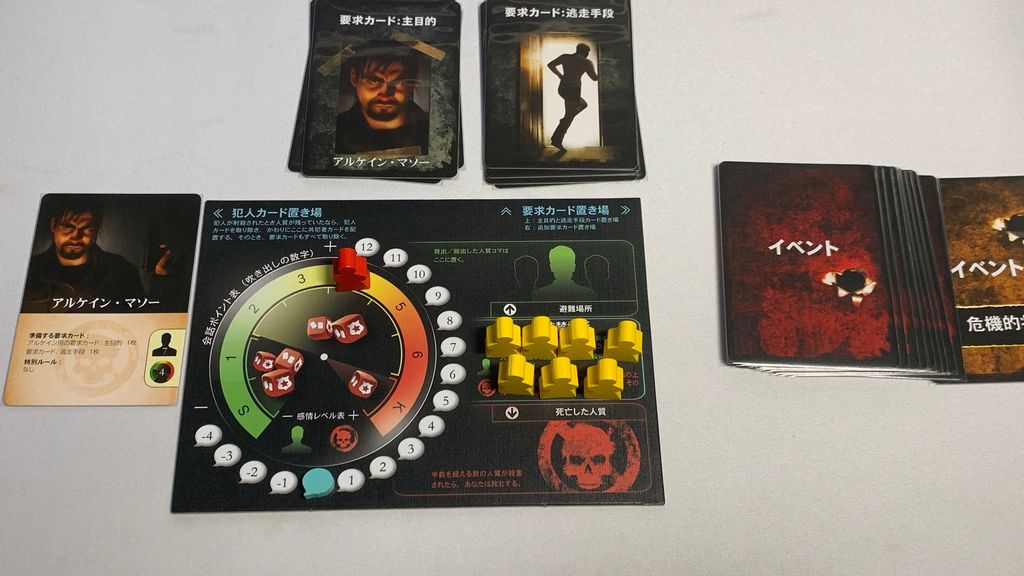 犯人の感情が収まっていけば振れるダイスの数も増え、説得が順調に進むようになりますが、イベントカード1枚で一気に危険になり、最後まで気が抜けません。