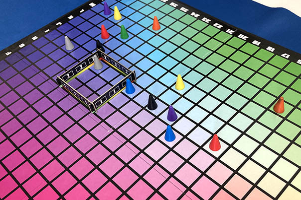 最初に親が、引いたカードの色を言葉で表現して、各プレイヤー、この色だと思う場所に自分のコマを置く。