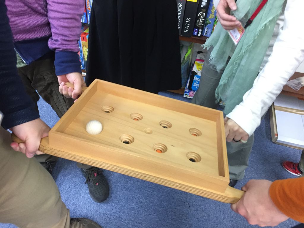 片方のプレイヤーは黒、もう片方が赤のマスに入れたら、それぞれ得点です。後はボードを傾けたり、上げたり、下げたりしながら頑張ります。