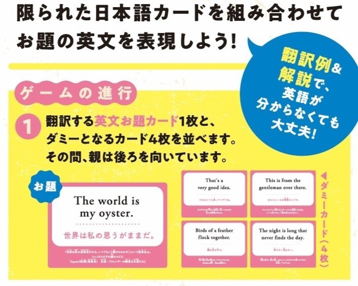 ①翻訳する英文お題カード1枚と、ダミーとなるカード4枚を並べます。その間、親は後ろを向いています。