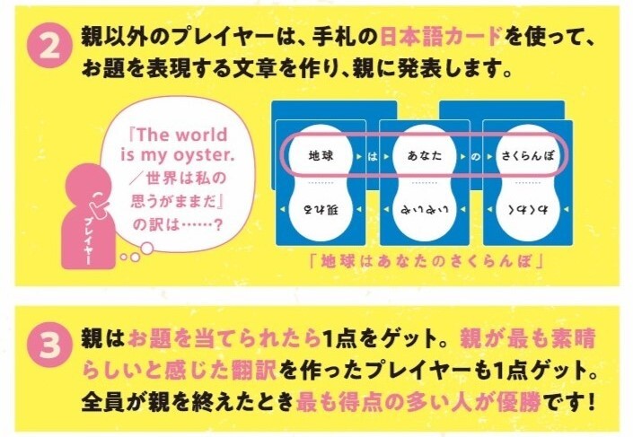 ③親はお題を当てられたら1点ゲット。親が最も素晴らしいと思った訳を作ったプレイヤーも1点ゲット。全員が親を終えたとき、最も得点が高い人が優勝です!