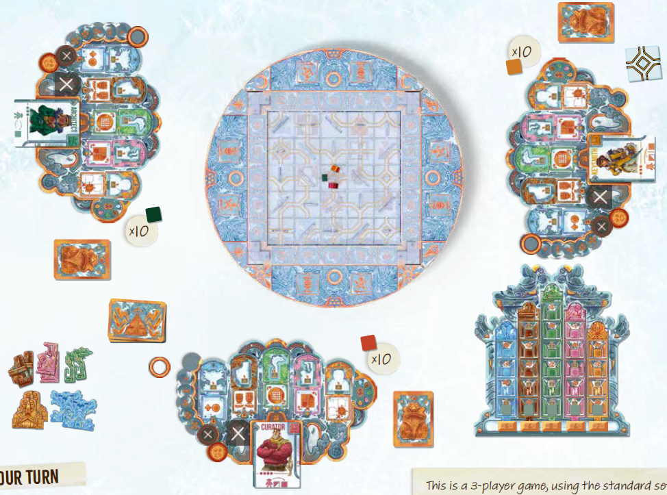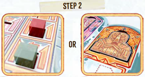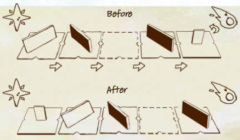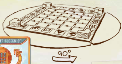 ゲーム全体を通して、プレイヤーはイベントまたはターンアクションを通じて寺院を回転させます。その際、対角上に正反対の2つのコーナーピンをつかみ、寺院グリッドの脚をテーブルに沿ってスライドさせます。
