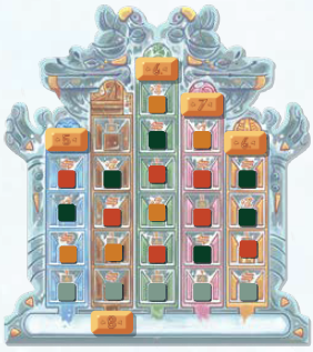 5. 研究トラック(S)を見つけて、すべてのプレイヤーの手の届くように寺院遺跡の近くに配置します。すべての勝利ポイントトークン(T)を見つけてシャッフルし、各列の下部にランダムに1つ配置します。