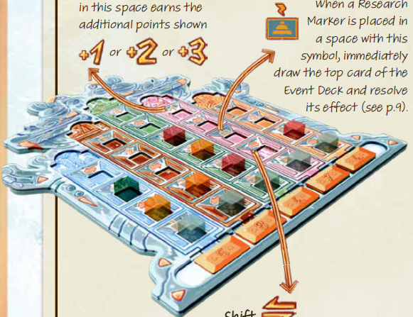 2人プレイでは、使用しないキャラクターの研究マーカーを各研究トラックの一番下の2つのスペース([2P]と[3P]シンボル付き)に配置します。3人プレイでは、各トラックの一番下のスペースに1つずつ配置します([3P]シンボル付き)。
