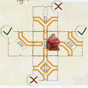 • 対応する色のキャラクターフィギュア (O)を1つ、開始通路の任意の場所に配置します(開始通路は、マップの金色の歯車面を使用している場合は中央の通路、代替セットアップの場合は5色のアイコンです)。