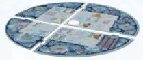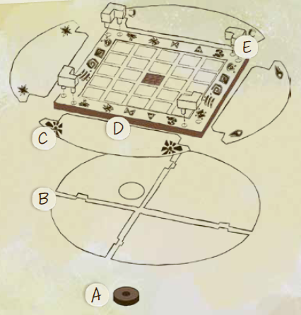 ピボットベース(A)をプレイエリアの中央に配置します。次に、4つの寺院マップセクション(B)を組み立て、ピボットベースが指定された開口部にしっかりと収まるように位置合わせします。