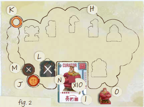 1. 各プレイヤーにプレイヤーボード(H)を配布します。各プレイヤーはキャラクターカード(I)を1枚選択し(またはランダムに割り当てられ)、プレイヤーボードの中央下に表向きに配置します。