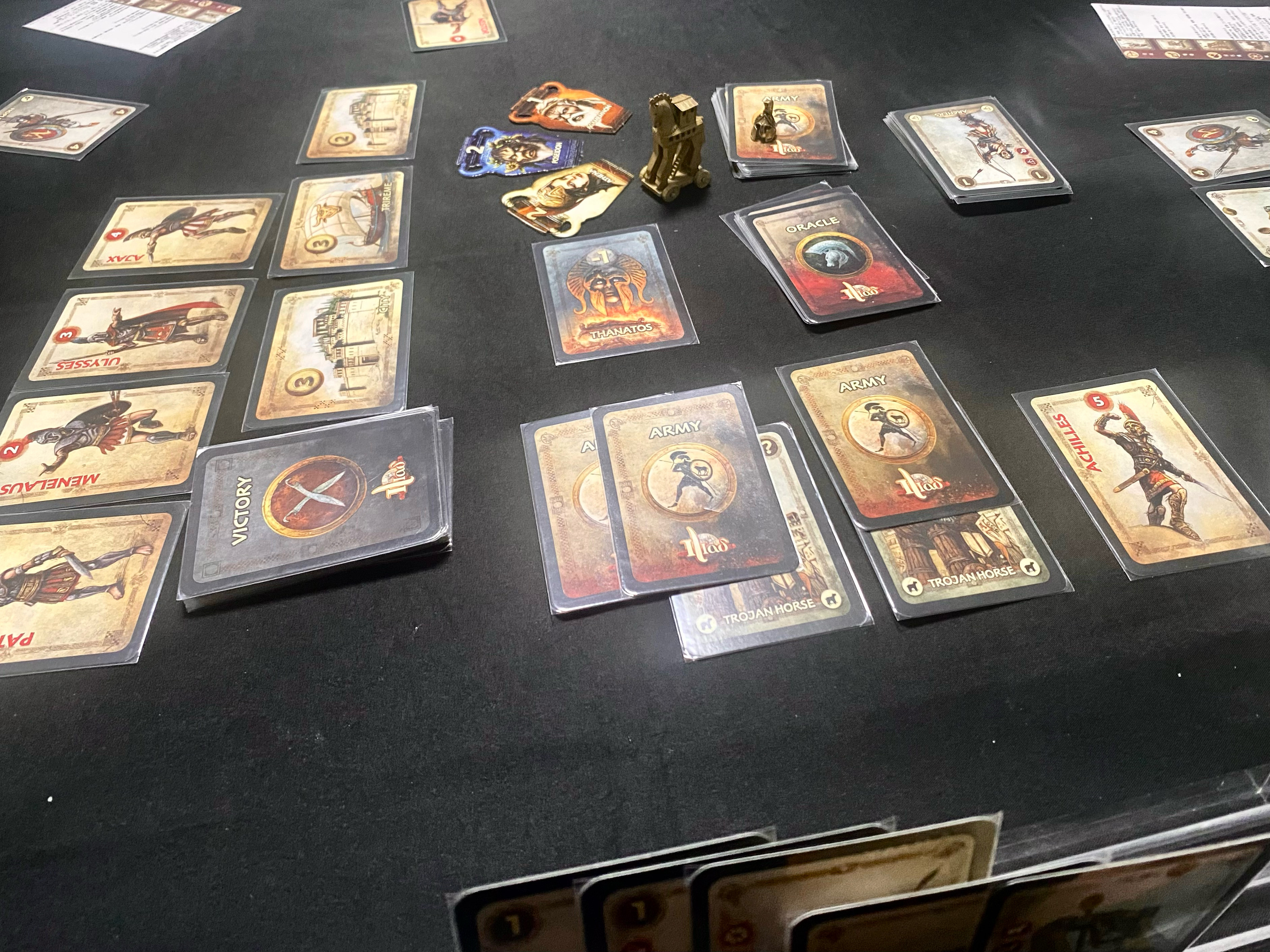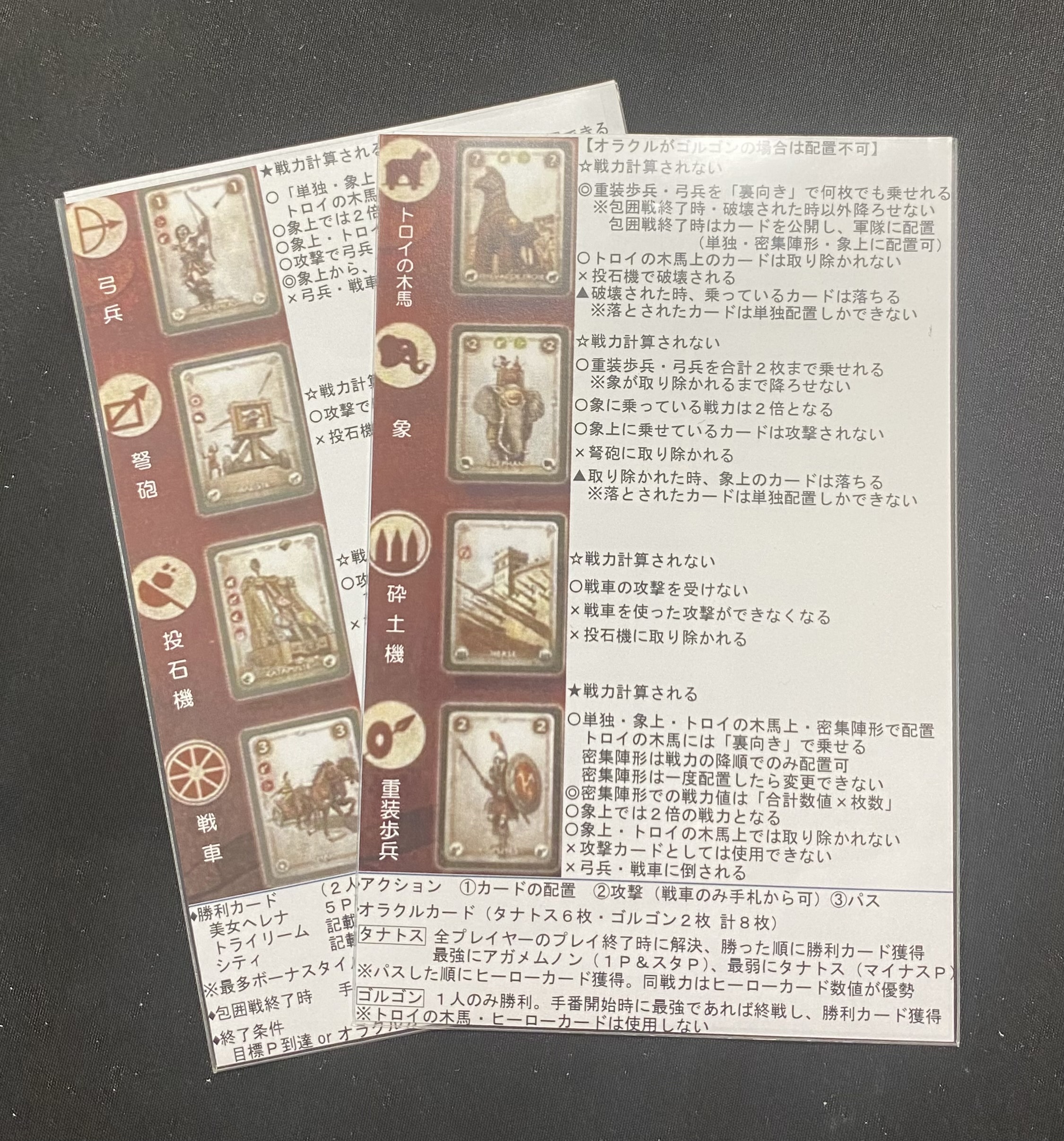 トロイア戦争をテーマにした、戦略的なカードゲームです。プレイヤーは軍隊や象、戦車そしてトロイの木馬など各カードの能力を上手く使いながら、各ラウンドの包囲戦に参戦し、VP獲得を狙います。各ラウンドの勝利条件やVPが異なり、どのラウンドを狙うか戦略的に楽しめます!中でもチーム戦は楽しく、6人集まる時は3チームに分かれてよくプレイします。戦略的なチーム戦のゲームはなかなかないので、重宝してます。ルールはシンプルでアイコンなどで分かりやすいのですが、簡単な自作サマリーなどがあると初心者でもすぐにプレイできるのでオススメです。