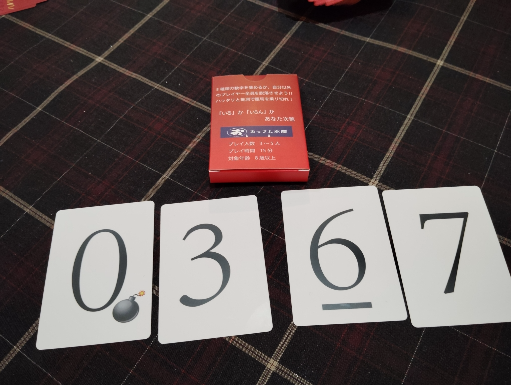 数字カードは0(3枚)、2〜7(数字と同じ枚数)で0は爆弾つきです。