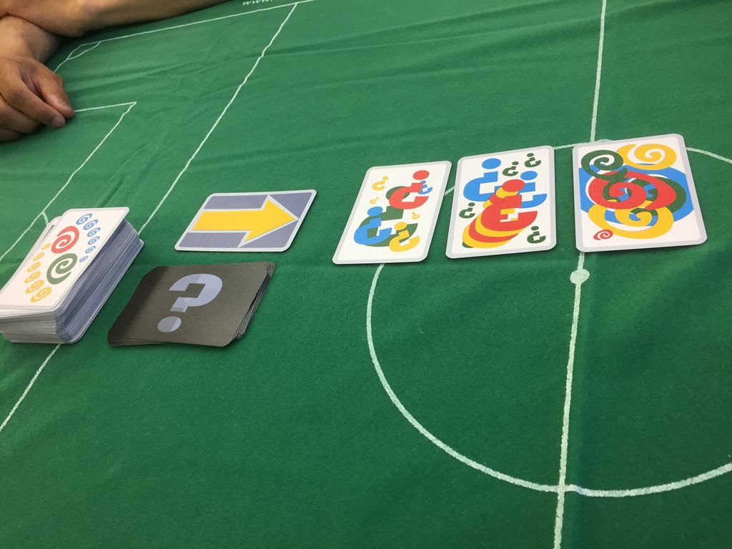 後は、手番プレイヤーは山札からカラーカードを引いて、1列に並んだカードのどこかに出すだけです。