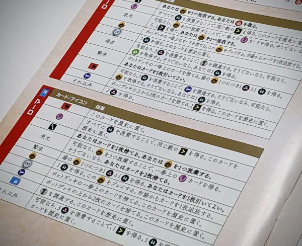 これを見るだけでゲームが進められるならこのページを開きっぱなしにしておけばいいところだが、もともとのルールの書き方がざっくり過ぎる上に日本語化にあたっての誤訳も多く、「これって対象書いてないけどこれも含めていいの?」とか、「1枚選ぶって書いてあるけど選ばなかったほうは捨てるの? 戻すの?」みたいな細かい処理でつまづきがちで、ルールブックやネット情報を調べることも多く、慣れるまではかなりプレイ外の時間がかかってしまうのも気になった。