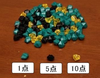 2宝物カードがめくれた場合:宝物を今洞窟内にいる人で等分する。あまりはカードの上に置いておく(トルコ石は1点、黒曜石は5点、黄金は10点である。別に10点のものにトルコ石を10個使っても良いが、なくならないようにする)
