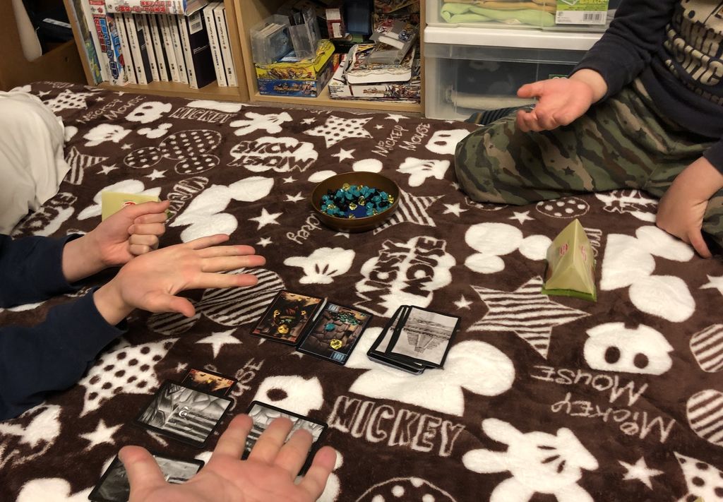 息子2人とプレイした感想ですが、基本的に山札からカードを1枚めくった後、進むか戻るかを決めるだけなので、うちの5歳児には特に難しくなくて、小5の息子とともに冒険をしている気分になるらしく、とても楽しんでプレイしていました。
