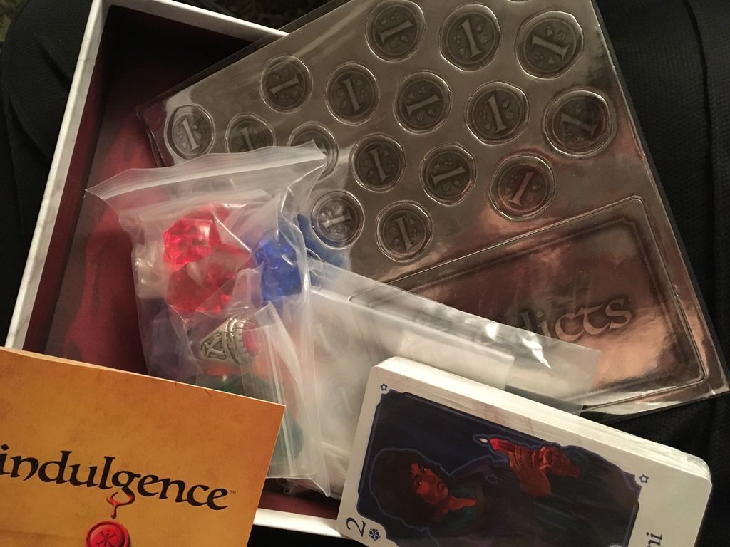 コンポーネントはトリックテイキングゲームにしてはかなり豪華です。お金のトークンは1金は紙ですが銀の光沢が綺麗ですし、5金は何故か宝石です。叛逆の時に使うリングは金属製で重量感があり、カードはタロットサイズの大きなカードで特別感があります。スリーブが見つかりにくかったりしますが。
