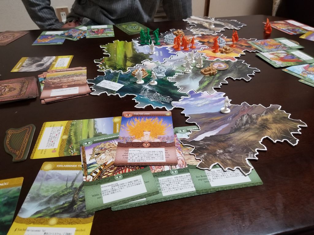 カードの効果で手に入る強力なカード(エピックカード)は、対応した基本のカードをアクションを使ってプレイすることで手に入ります。このカードにはケルト神話の特徴的な出来事が描かれており、基本的に前述の2種類のカードよりも効果が大きいです。このカードは山札からランダムに引いてくるため、このゲームにおける逆転やドラマを作り出す役割を果たしています。
