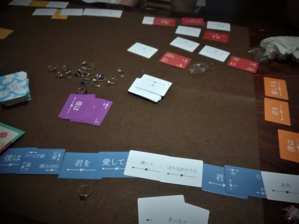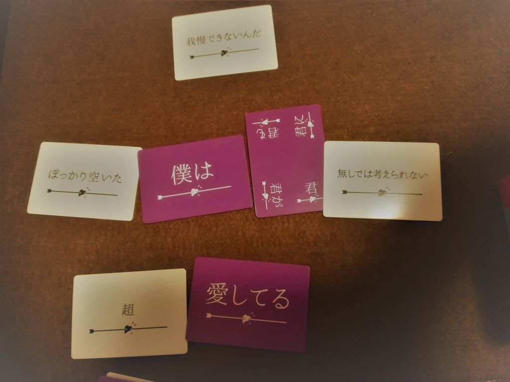 題名通り、元々持っている基本カードと、配られたカードをうまく組み合わせて、即興でプロポーズの言葉を作るゲームです