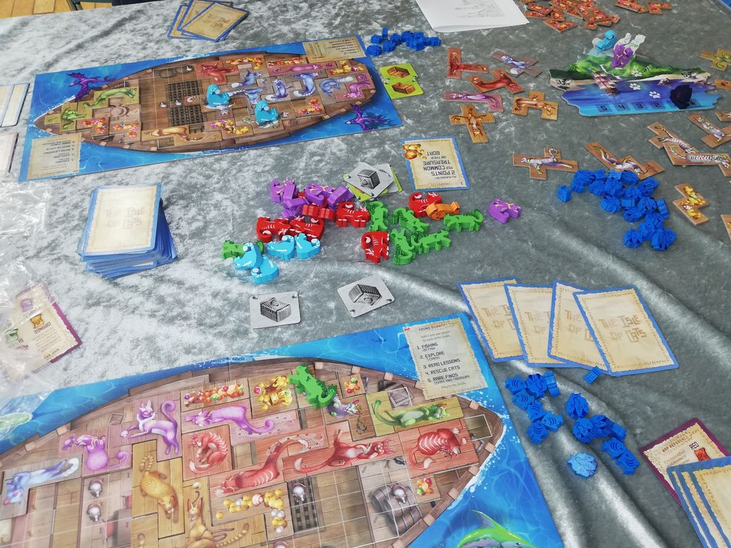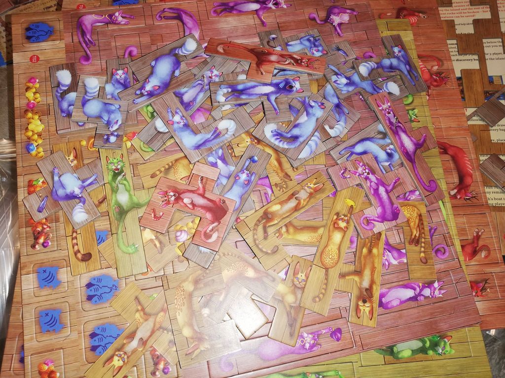 船がプレイヤーボード、助けた猫や発見したお宝を積み込む。 右上の小さいボードがメインの島ボード、手番順とラウンドを管理する。島ボードの左右に猫がくつろぐフィールドがあってプレイヤーはそこからおびき寄せるための魚とカゴで猫ちゃんを救出するのだ。